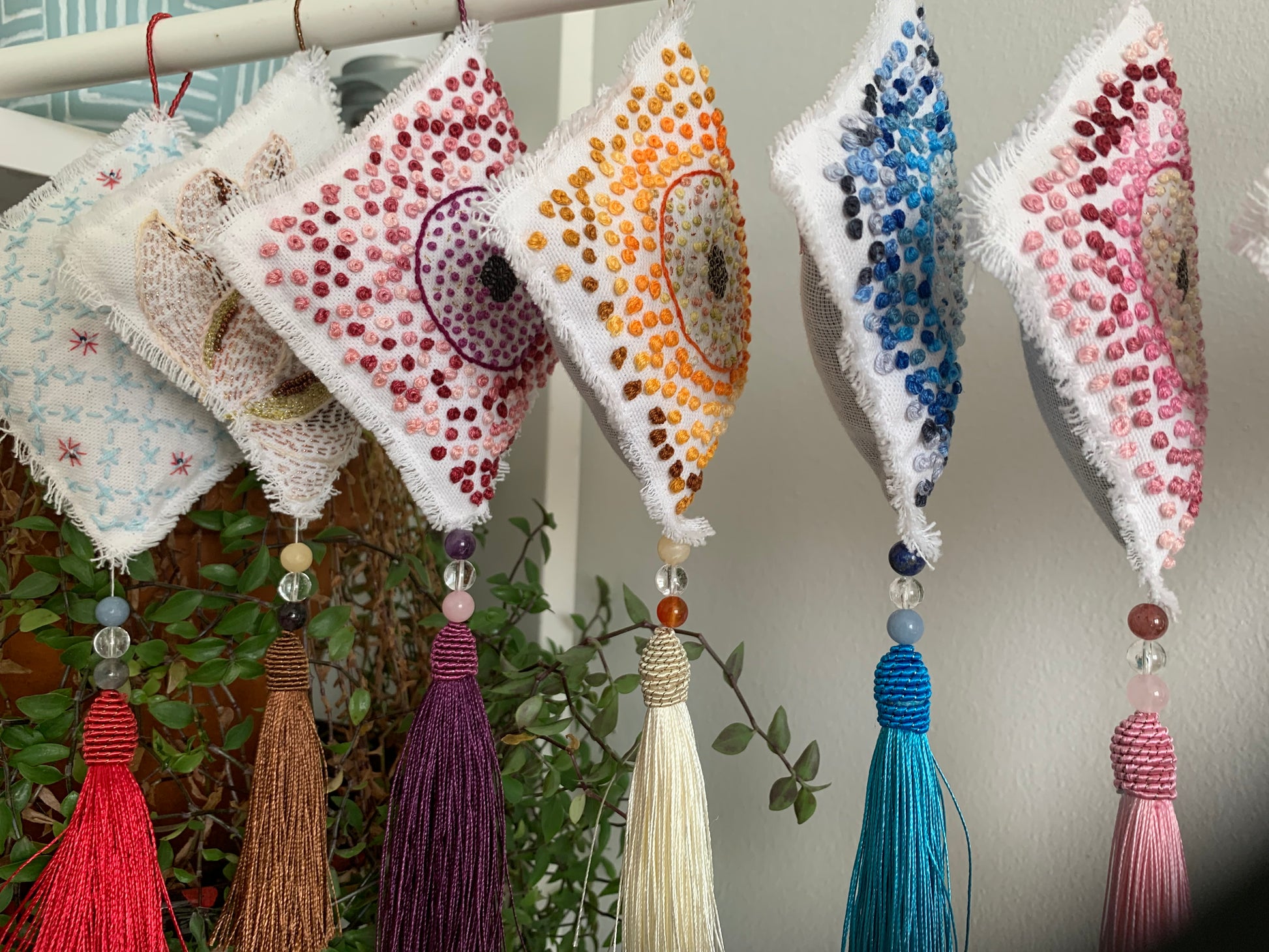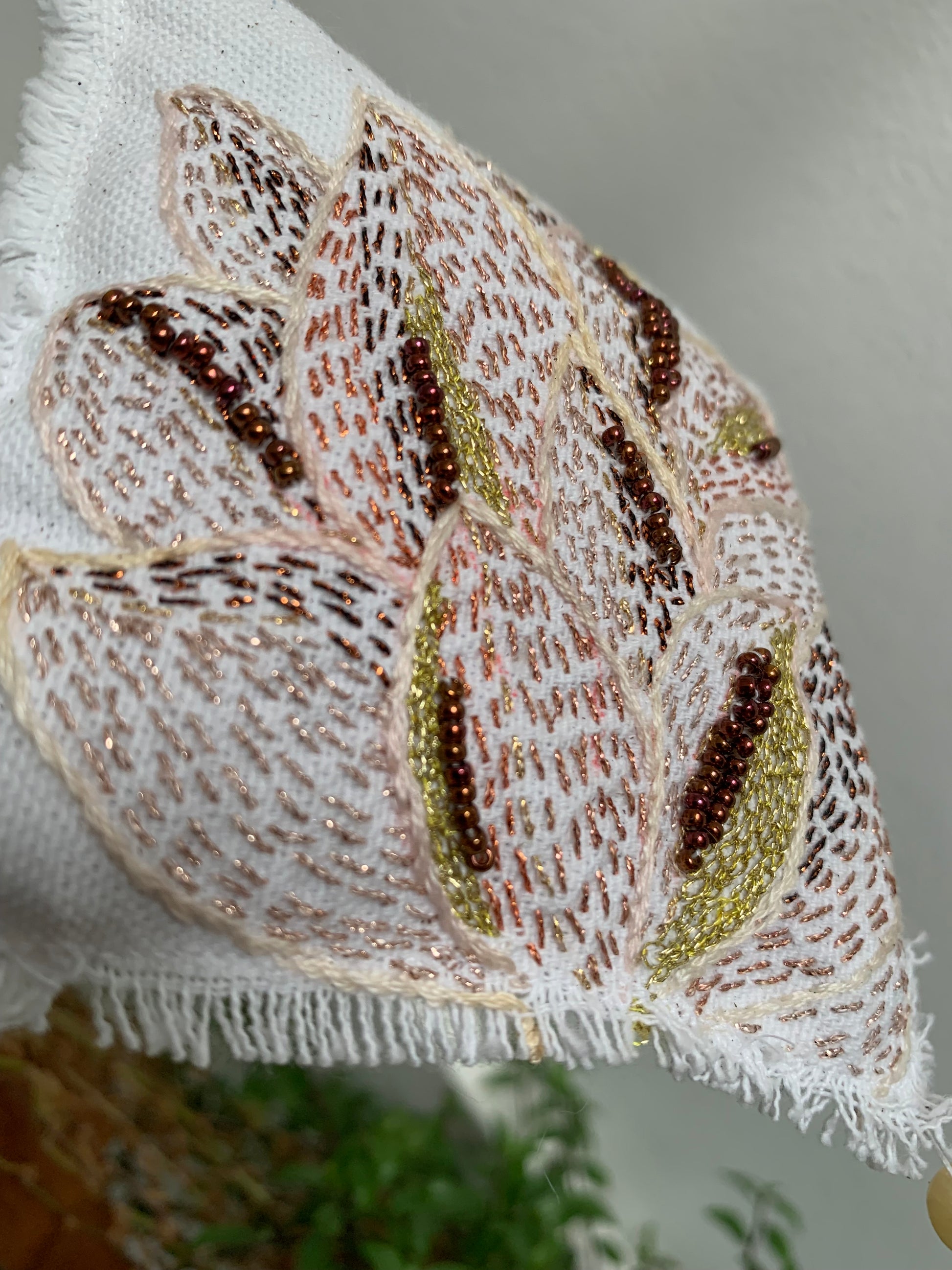 Poche remplie de lavande séchée bio, une face brodée en coton blanc et une face en étamine. Taille 10 x 10cm. Pampille marron clair de 12cm dont perles en pierres véritables. Coton DMC, fils métallisés doré, cuivré et or rose, perles rocaille.