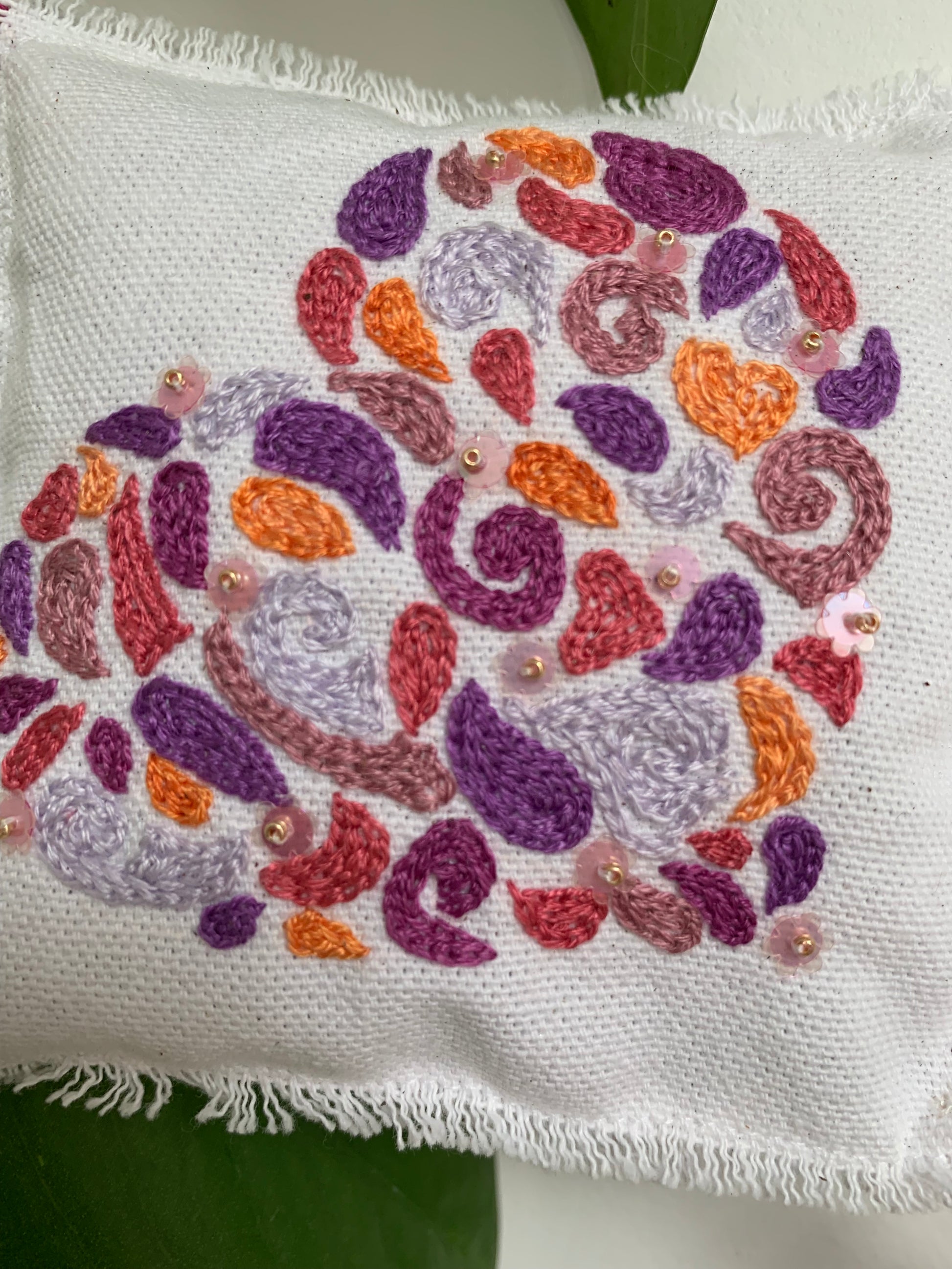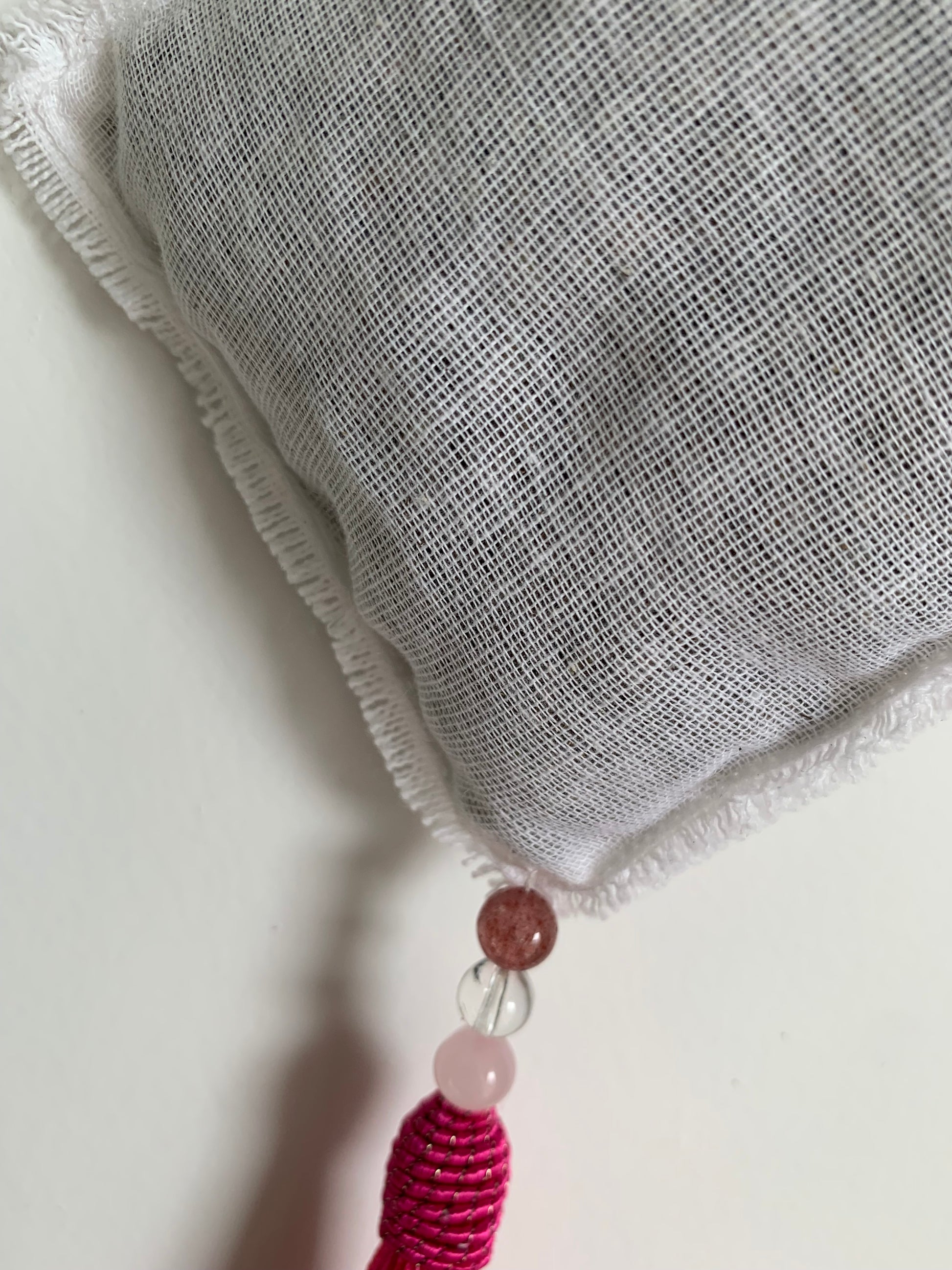 Poche remplie de lavande séchée bio, une face brodée en coton blanc et une face en étamine. Taille 10 x 10cm. Pampille rose fuchsia de 12cm dont perles en pierre véritables. Coton DMC perles et sequins fleur.