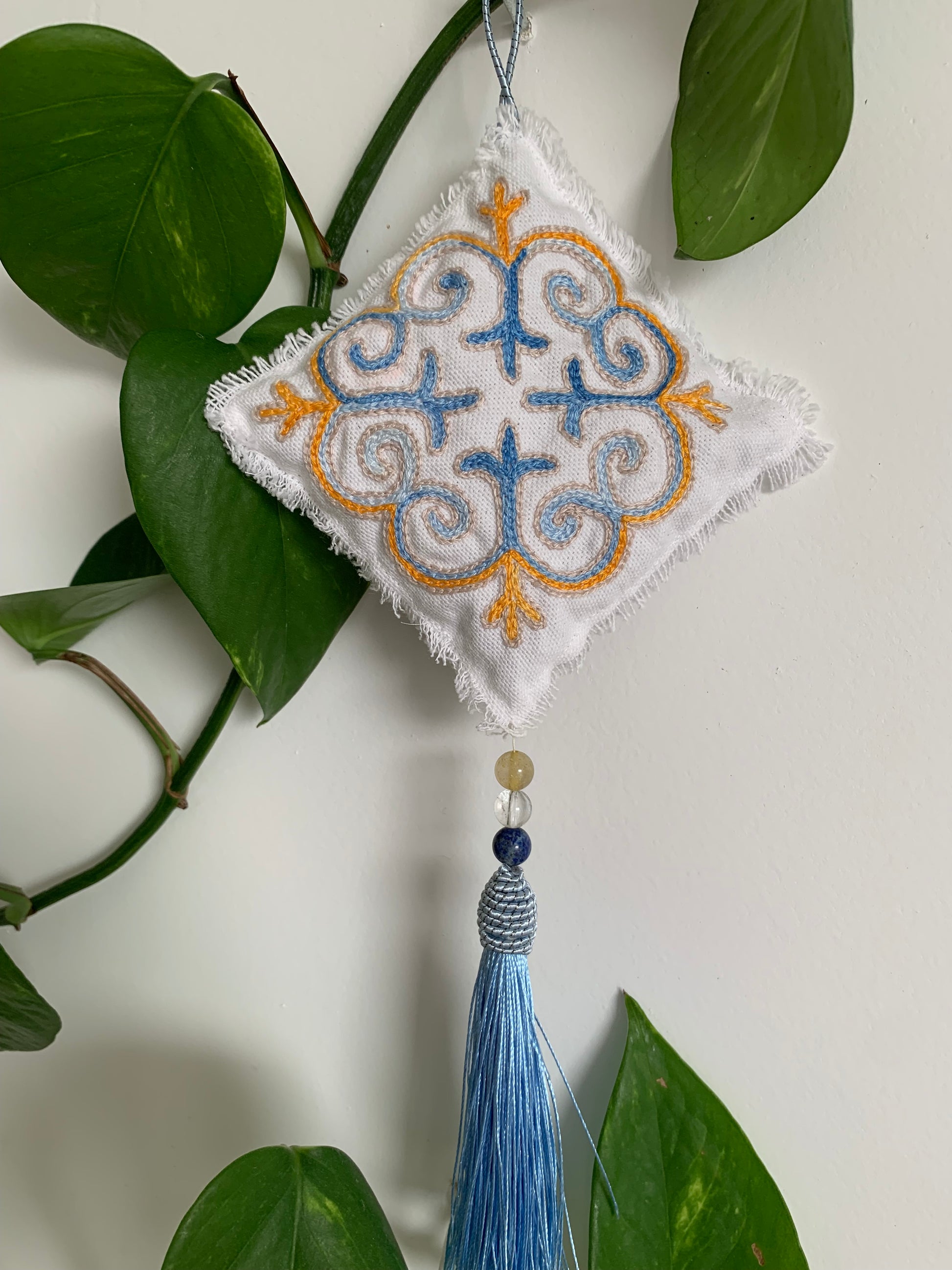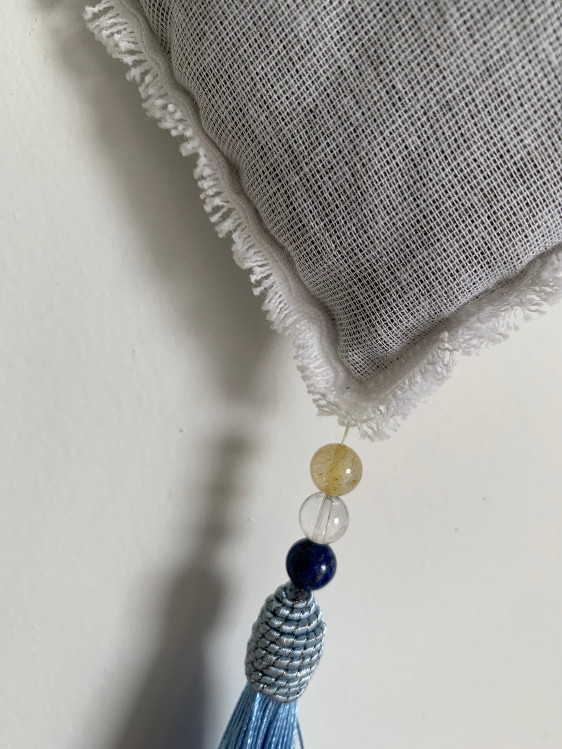 Poche remplie de lavande séchée bio, une face brodée en coton blanc et une face en étamine. Taille 10 x 10cm. Pampille bleu azur de 12cm dont perles en pierres véritables. Coton DMC.