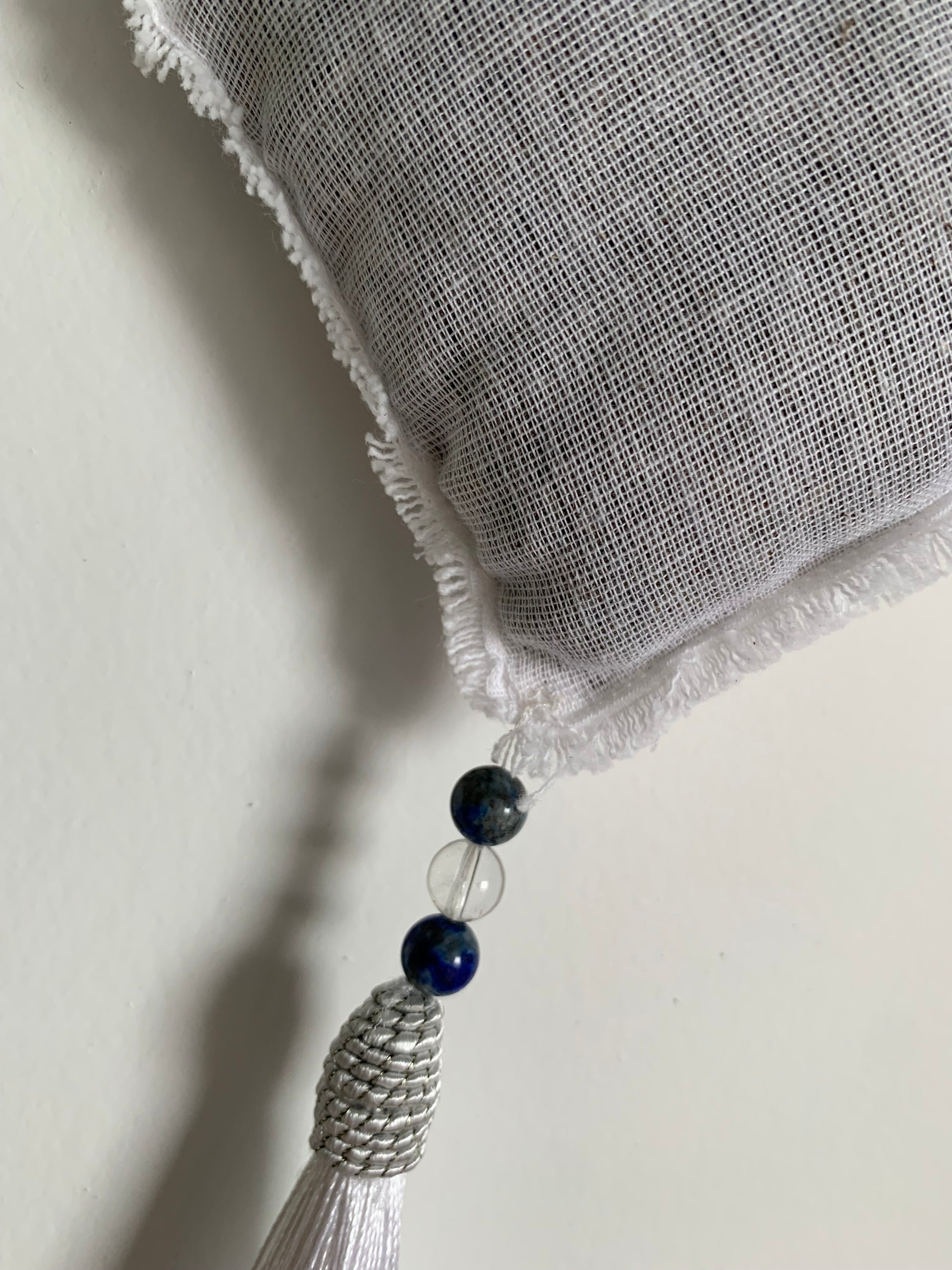 Poche remplie de lavande séchée bio, une face brodée papillons en coton blanc et une face en étamine. Taille 10 x 10cm. Pampille blanche de 12cm dont 3 perles en pierre véritable. Coton DMC.