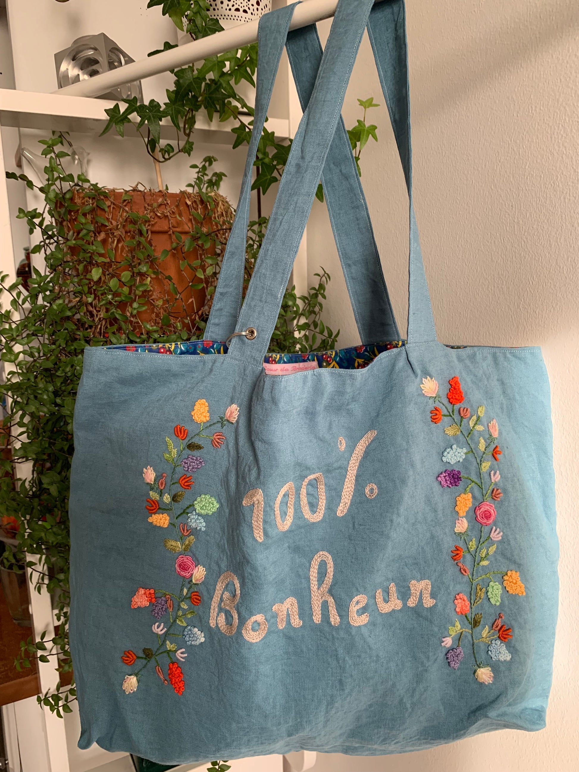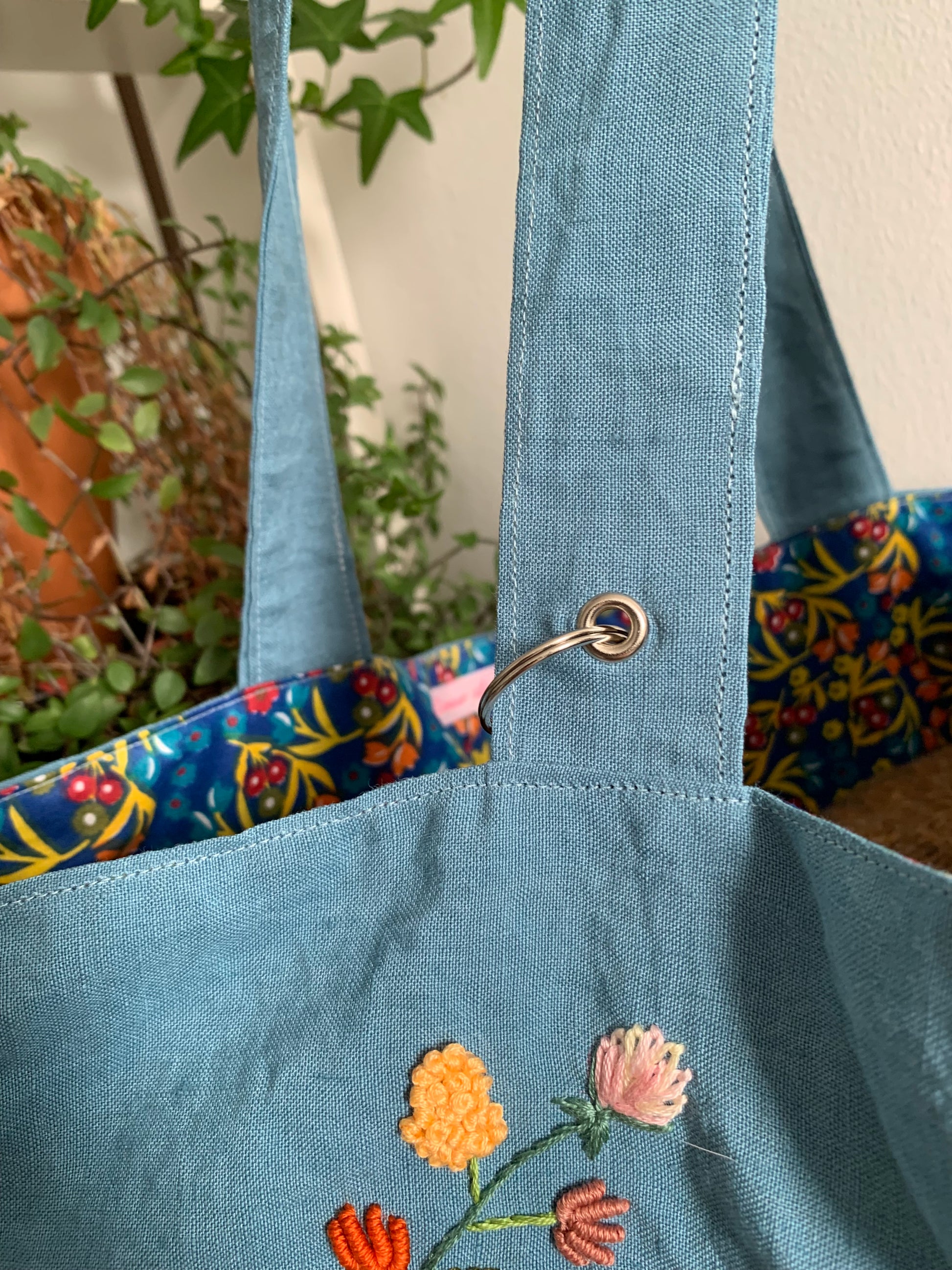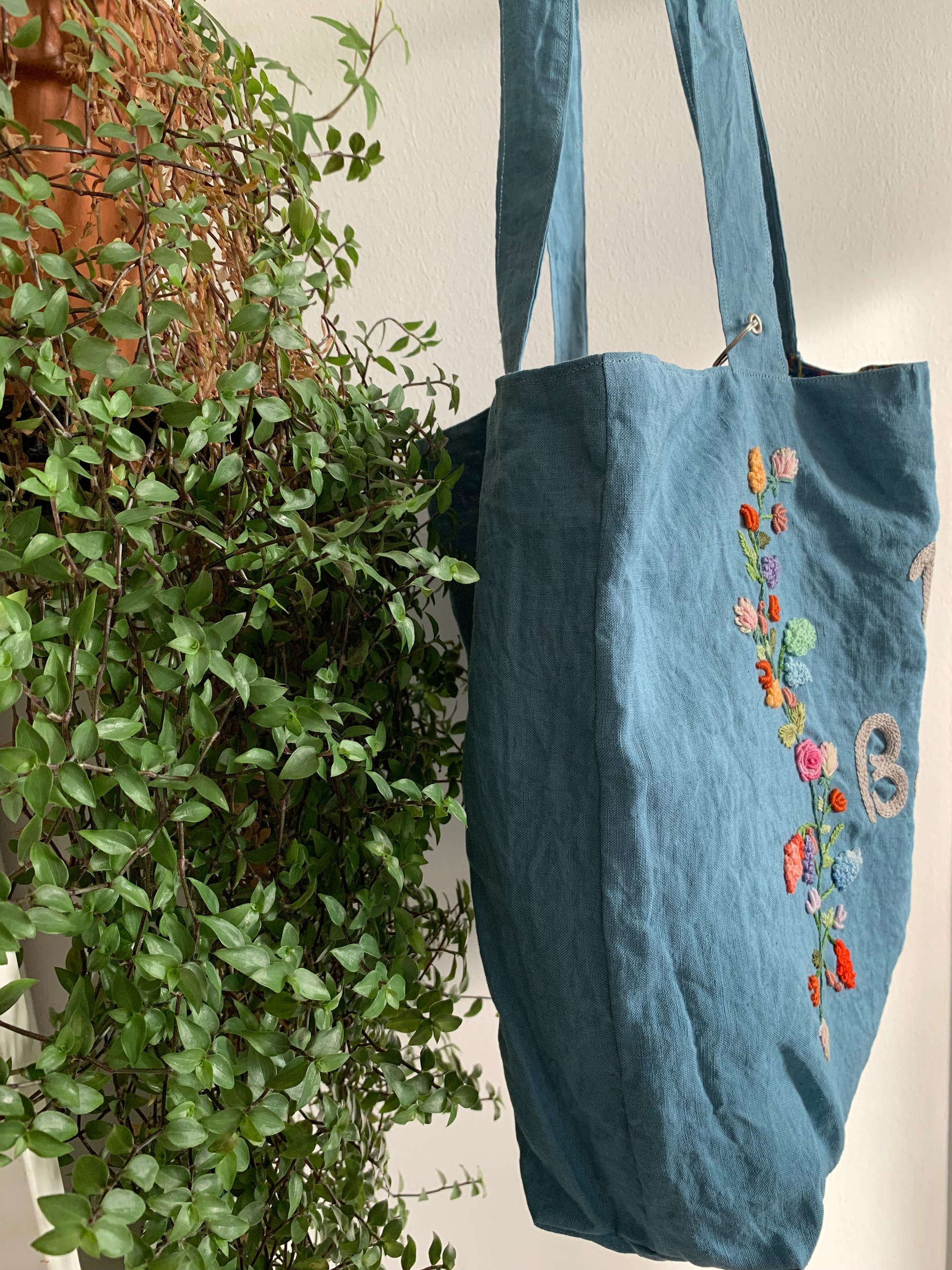 Sac cabas en lin froissé bleu glacier, brodé main, doublé coton impression fleuri multicolore. Taille: haut.32cm / larg. 50cm / prof. 11cm/long. de anse 60cm / haut. totale 60cm.