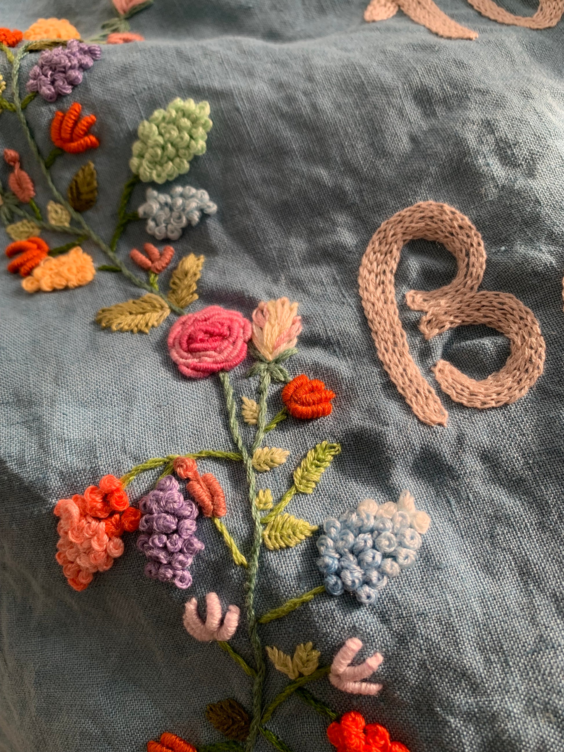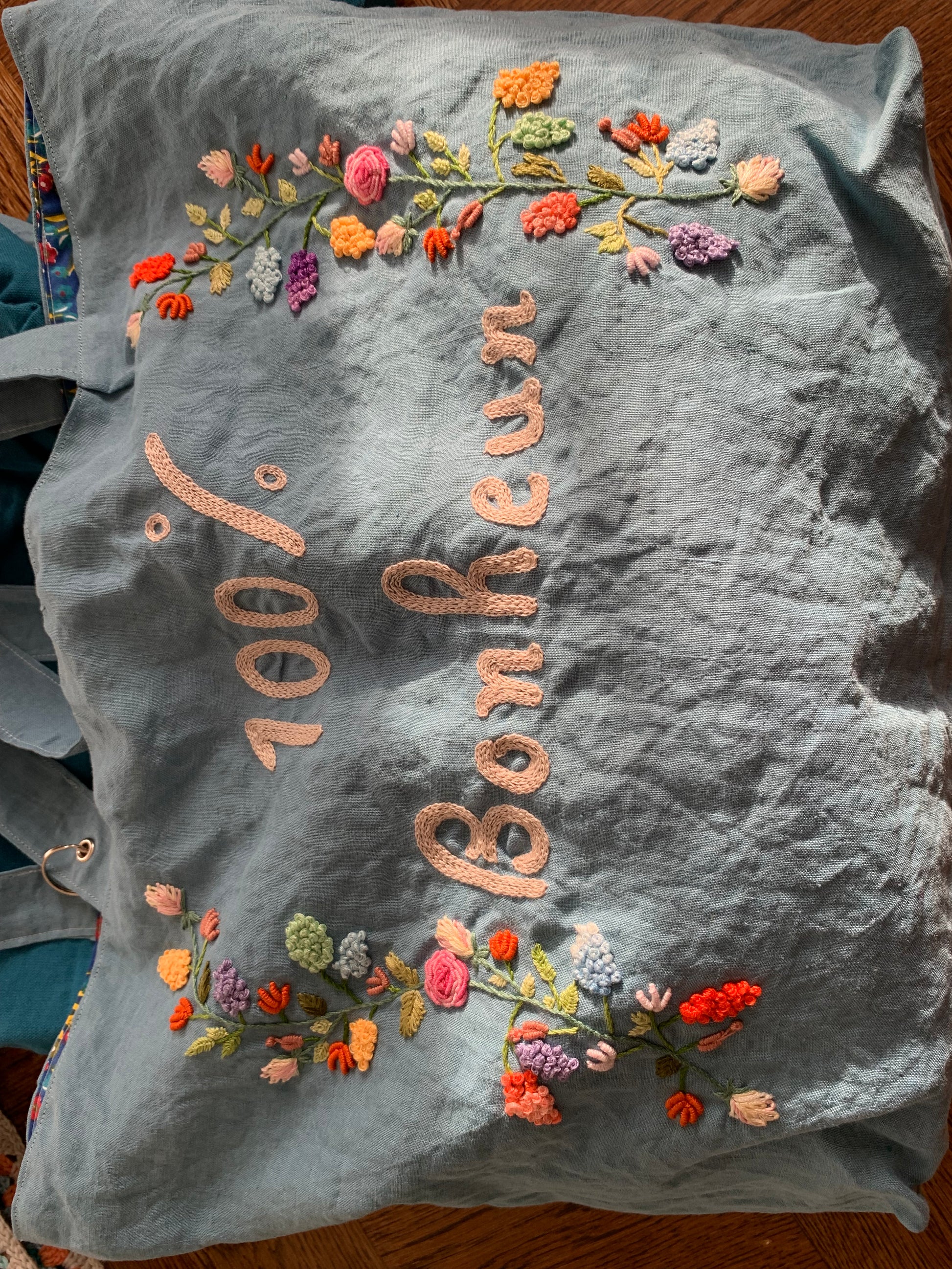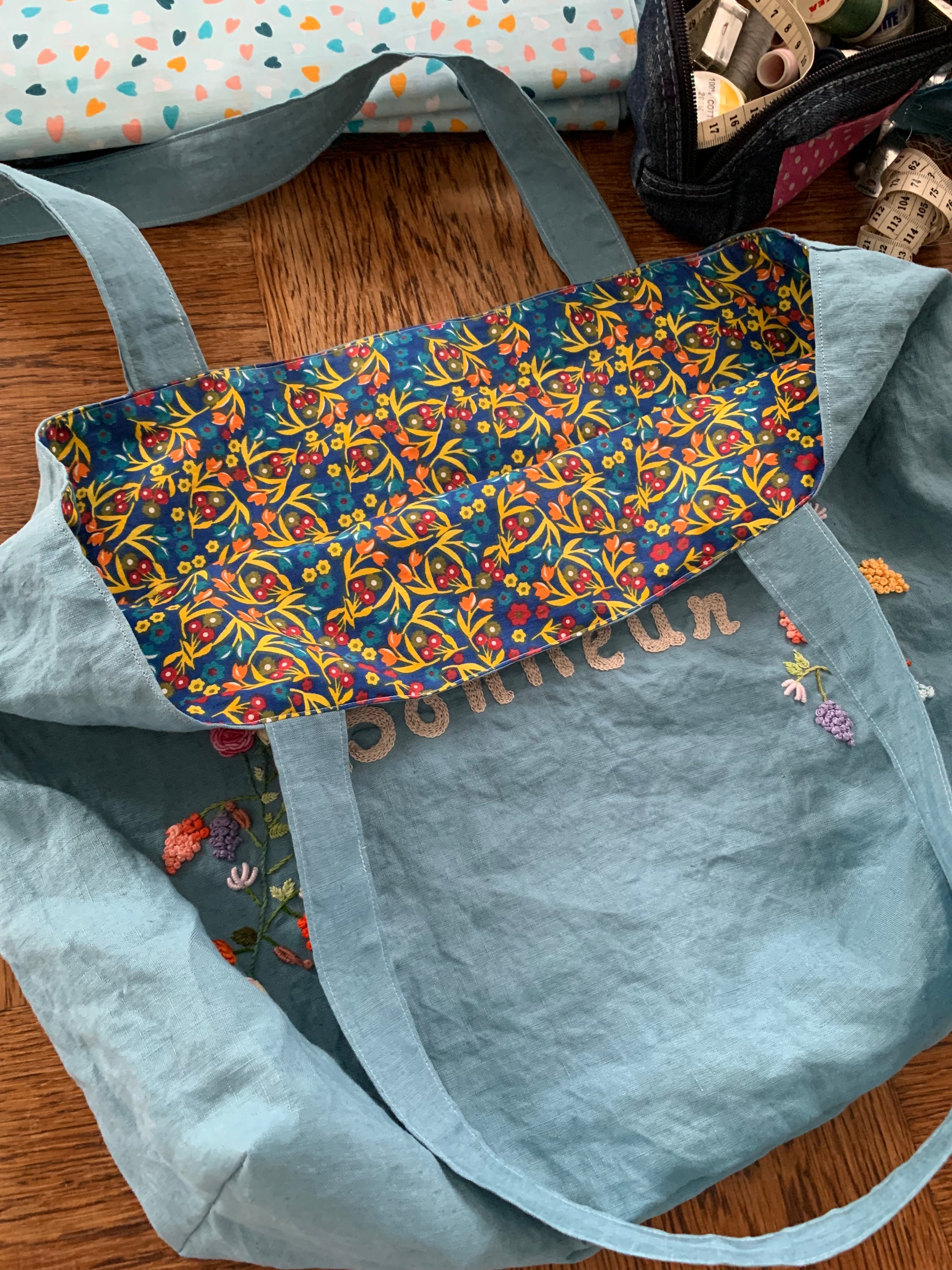 Sac cabas en lin froissé bleu glacier, brodé main, doublé coton impression fleuri multicolore. Taille: haut.32cm / larg. 50cm / prof. 11cm/long. de anse 60cm / haut. totale 60cm.