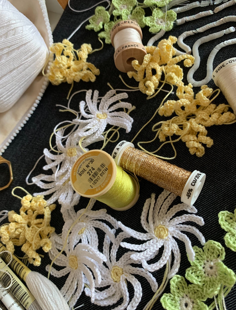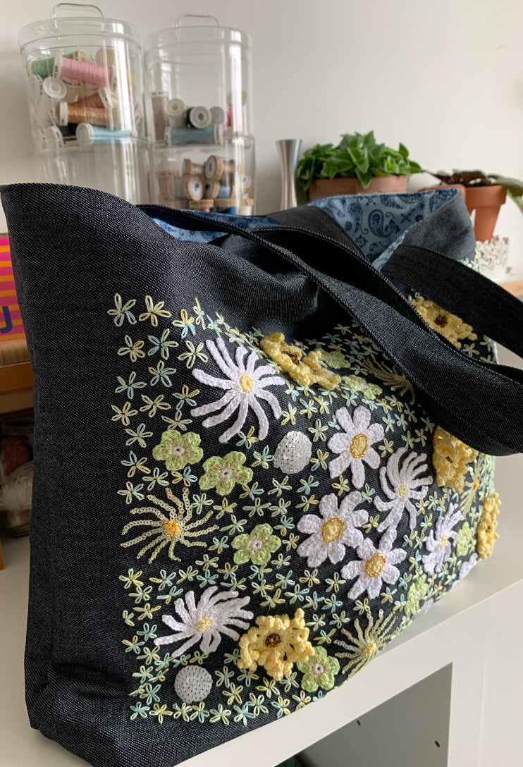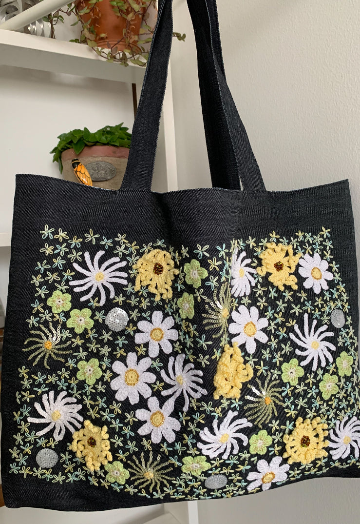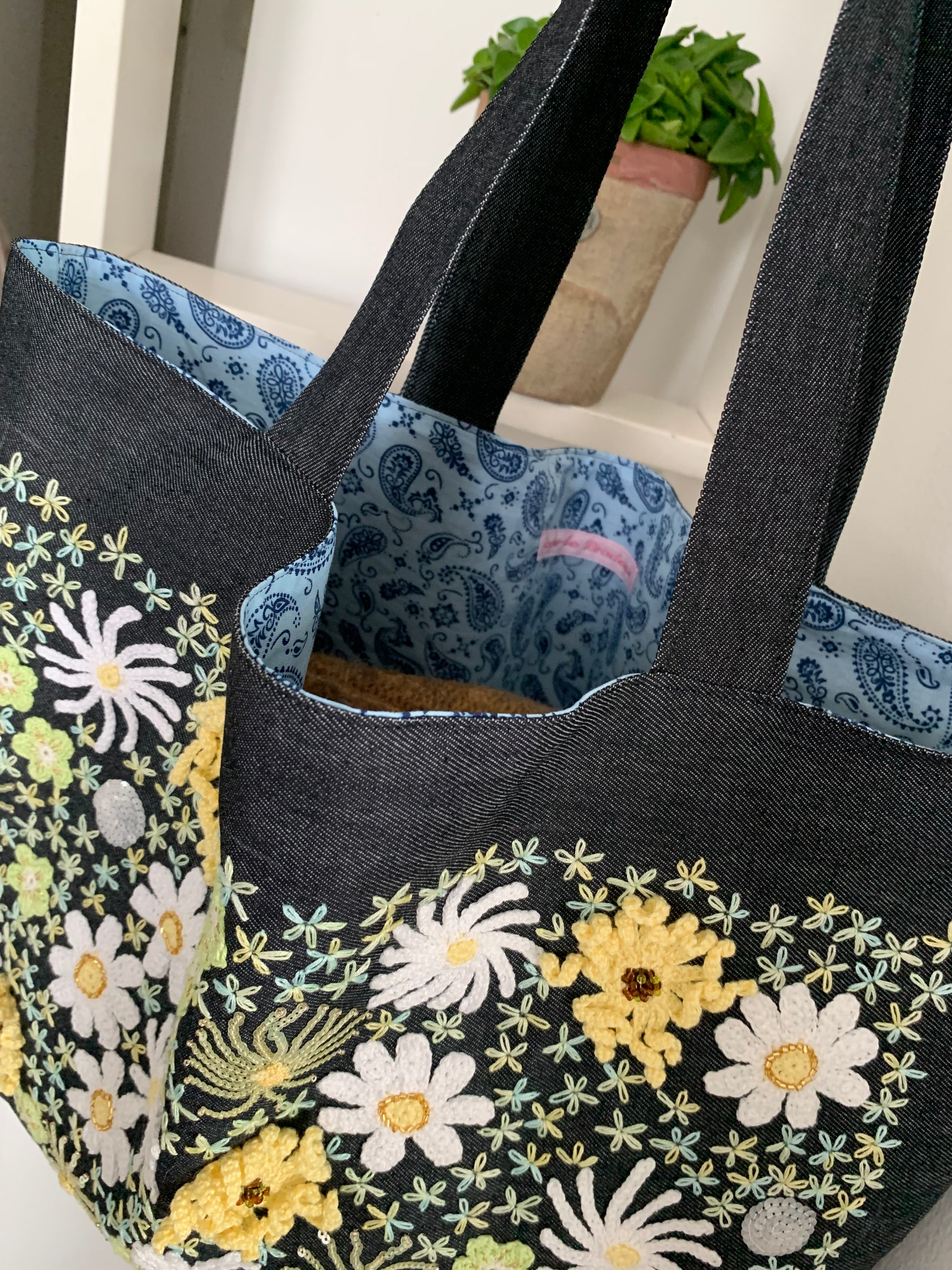 Sac cabas en jean bleu foncé, brodé main, fleurs au crochet en 100% coton mercerisé, perles, demi-tubes, sequins, doublé coton impression arabesques bleu ciel. Taille : haut. 32cm / larg. 50cm / prof. 12cm / long. de anse 60cm / haut. totale 60cm.