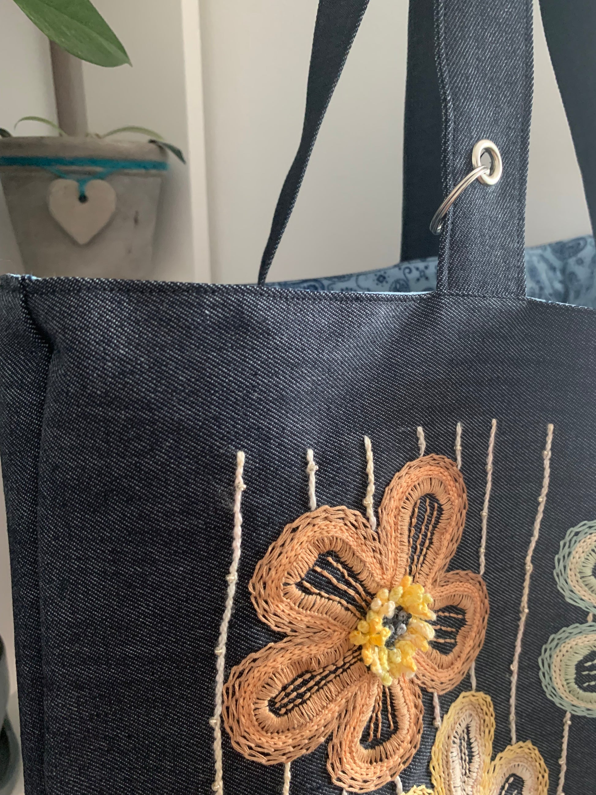 Sac cabas en jean bleu foncé, brodé main, perlé, doublé coton impression arabesques bleu ciel. Taille : haut. 32cm / larg. 50cm / prof. 12cm / long. de anse 60cm / haut. totale 60cm.