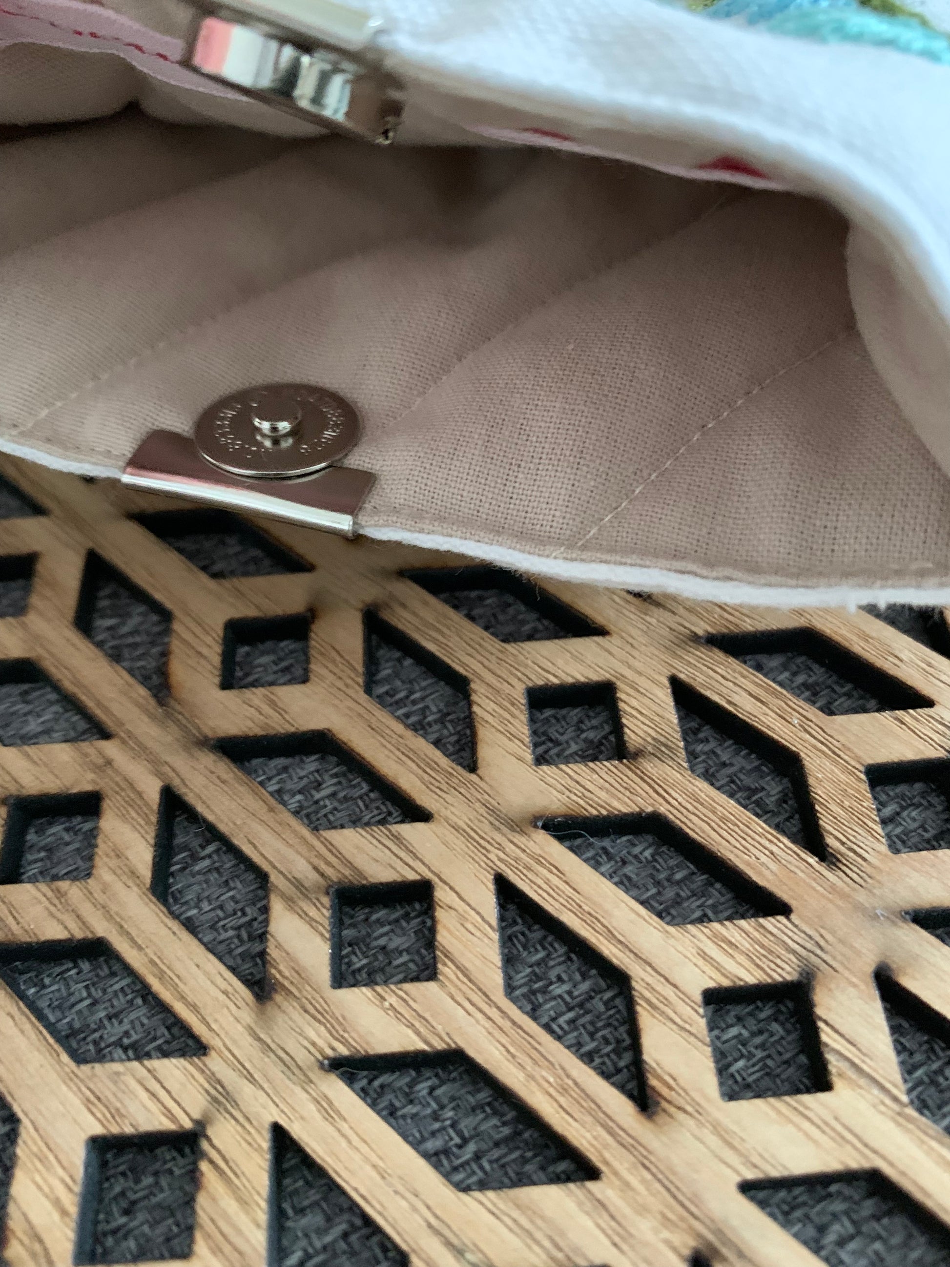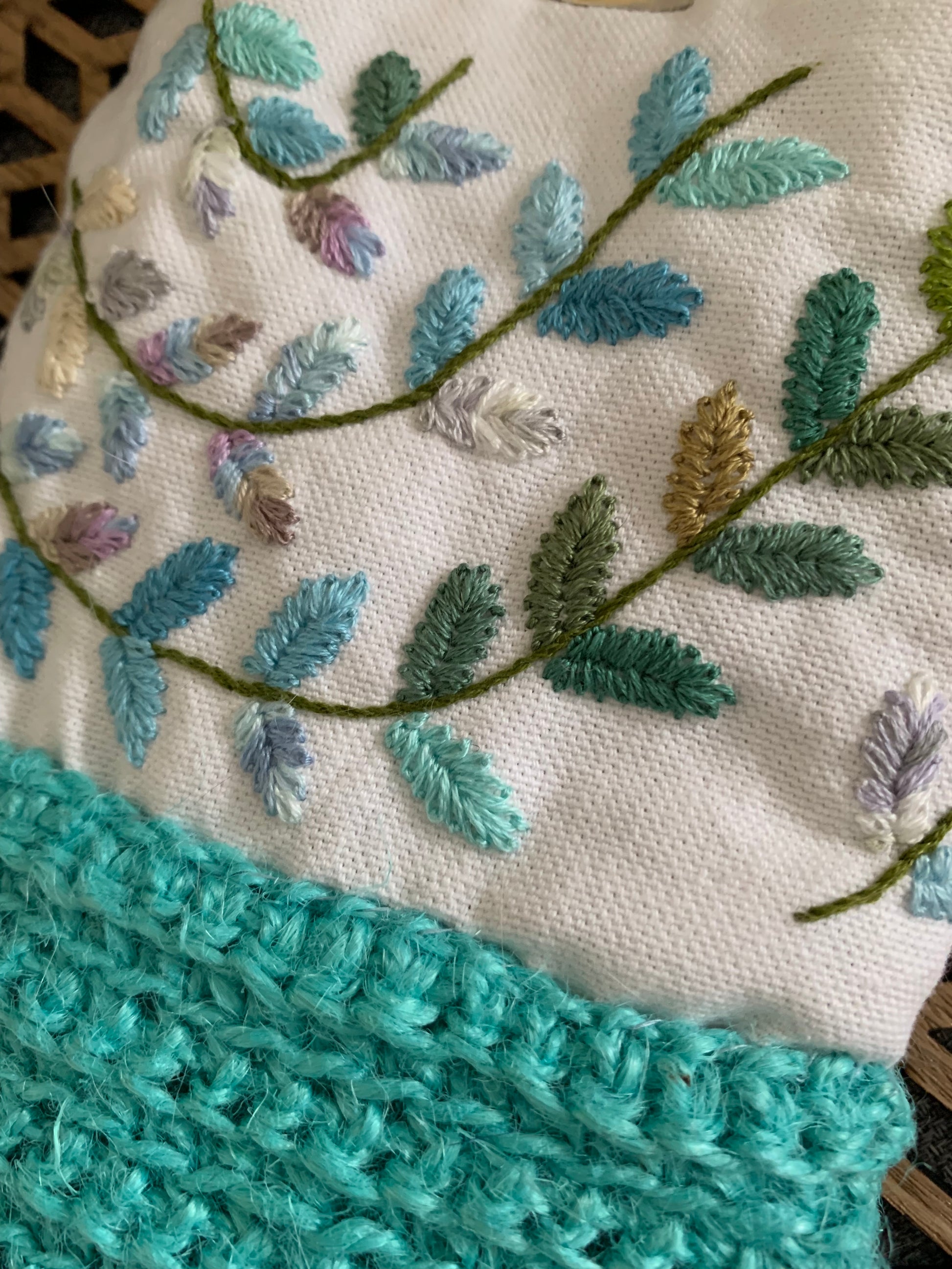 Pochette brodée sur coton blanc et jute turquoise crochetée; doublée coton sable et matelassée. Motif: feuillage. Fermeture: clip aimanté. Haut. 21cm ( 11cm brodé et 10cm jute violette) Larg. ext. 13cm / larg. int. 12cm.