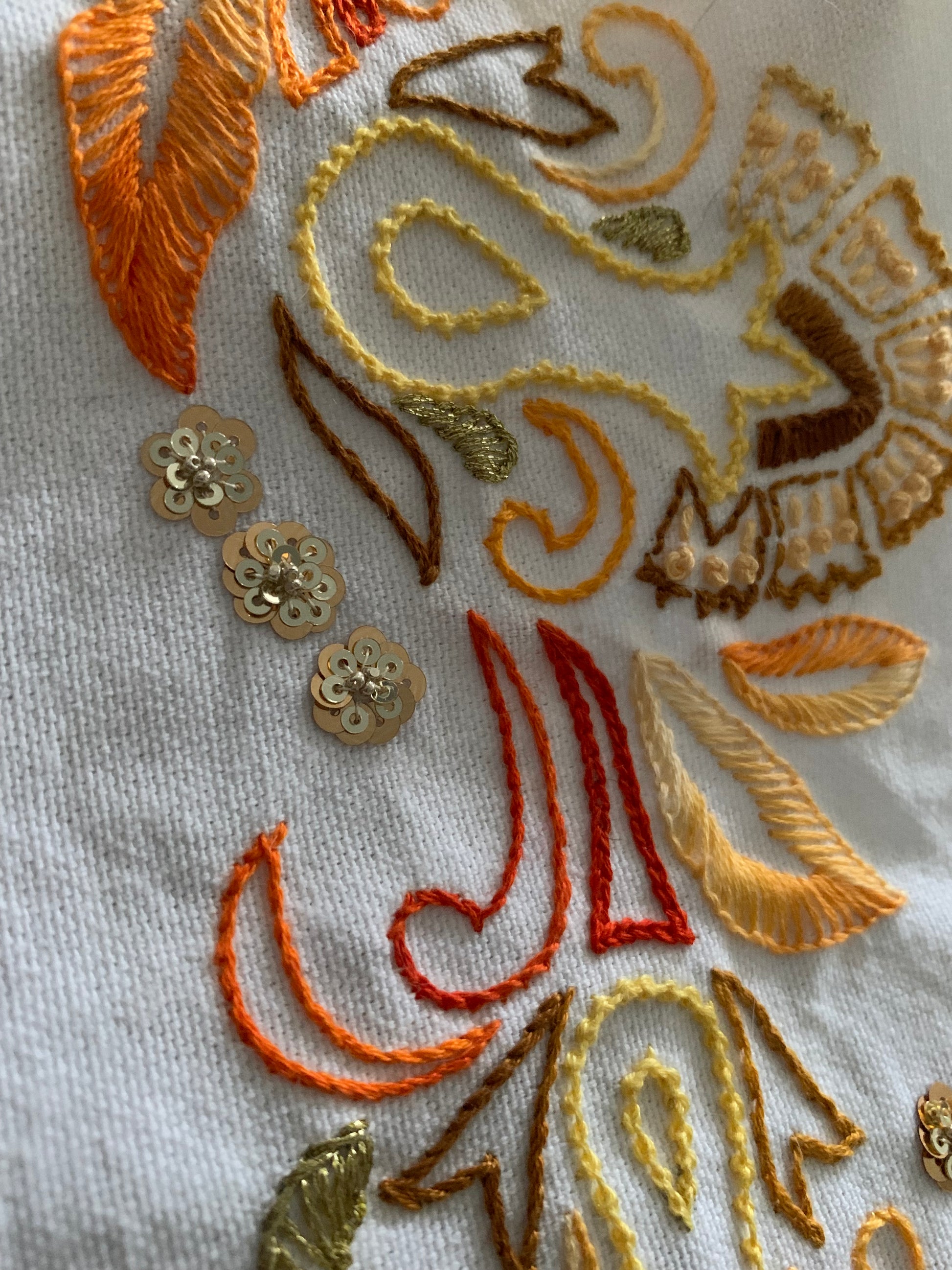 Pochette brodée, perlée et sequins dorés sur coton blanc et jute jaune crochetée, doublée coton sable et matelassée. Motif: arabesques. Fermeture: clip aimanté. Haut. 21cm ( 11cm brodé et 10cm jute jaune). Larg. ext. 13cm / larg. int. 12cm.