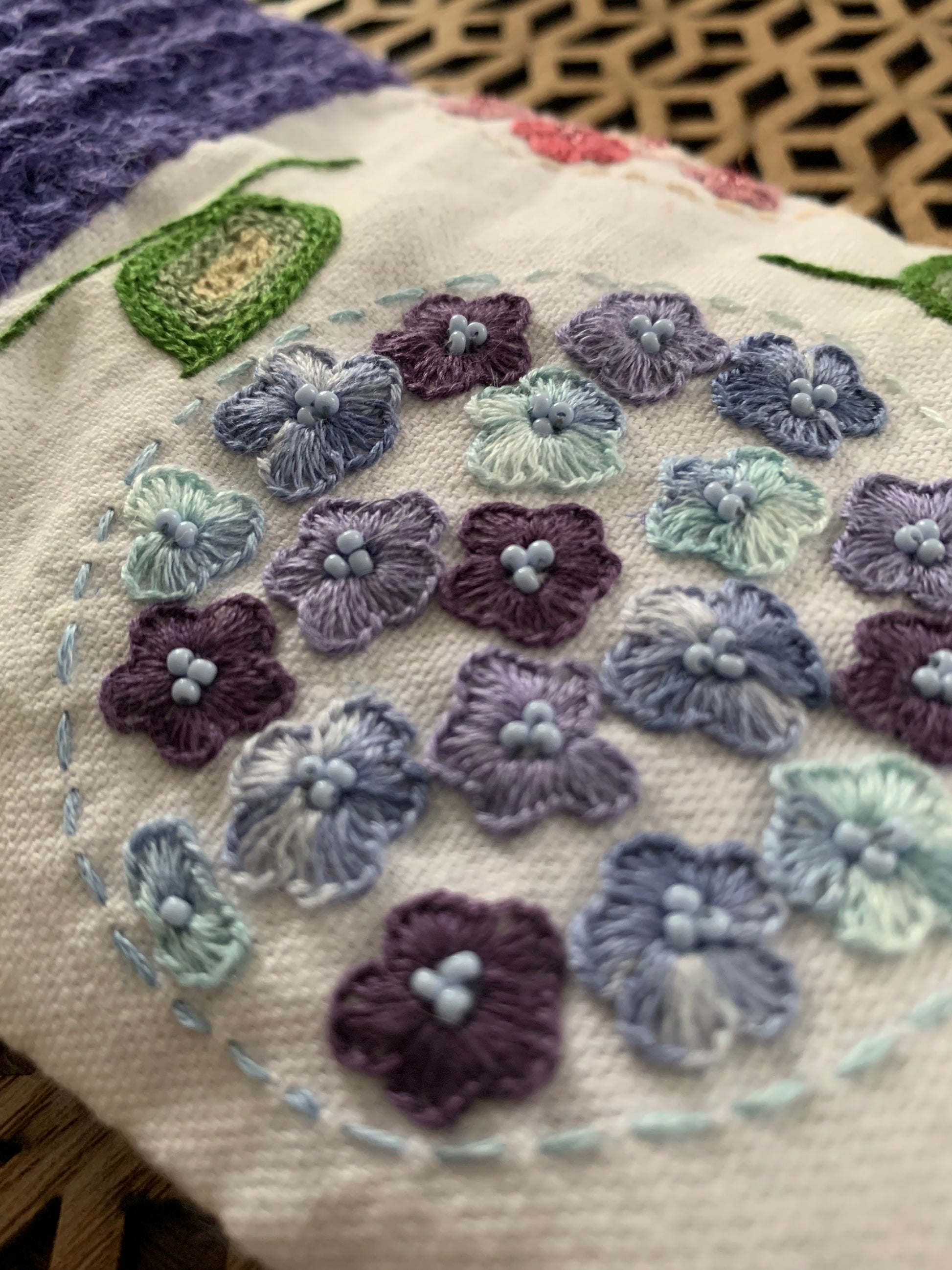 Pochette brodée, perlée sur coton blanc et jute violette crochetée; doublée coton sable et matelassée. Motif: hortensias. Fermeture: clip aimanté. Haut. 21cm ( 11cm brodé et 10cm jute violette) Larg. ext. 13cm / larg. int. 12cm.