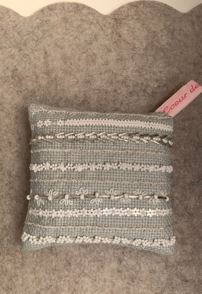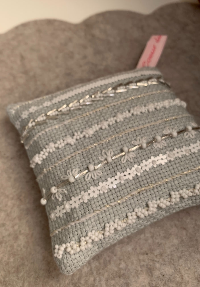 Pochon de lavande bio brodé au fil Tonkin et coton DMC, perlé rocaille blanc deux tailles, paillettes fleur blanc opaque et tubes twisté argent brillant, sur toile Aïda vert-de-gris pâle. Dos coton milleraie blanc.