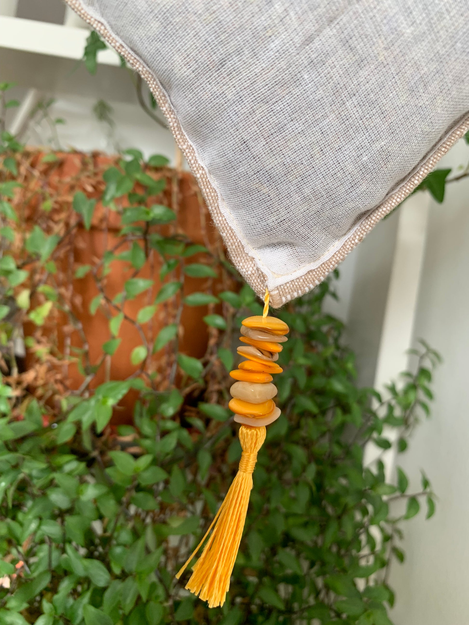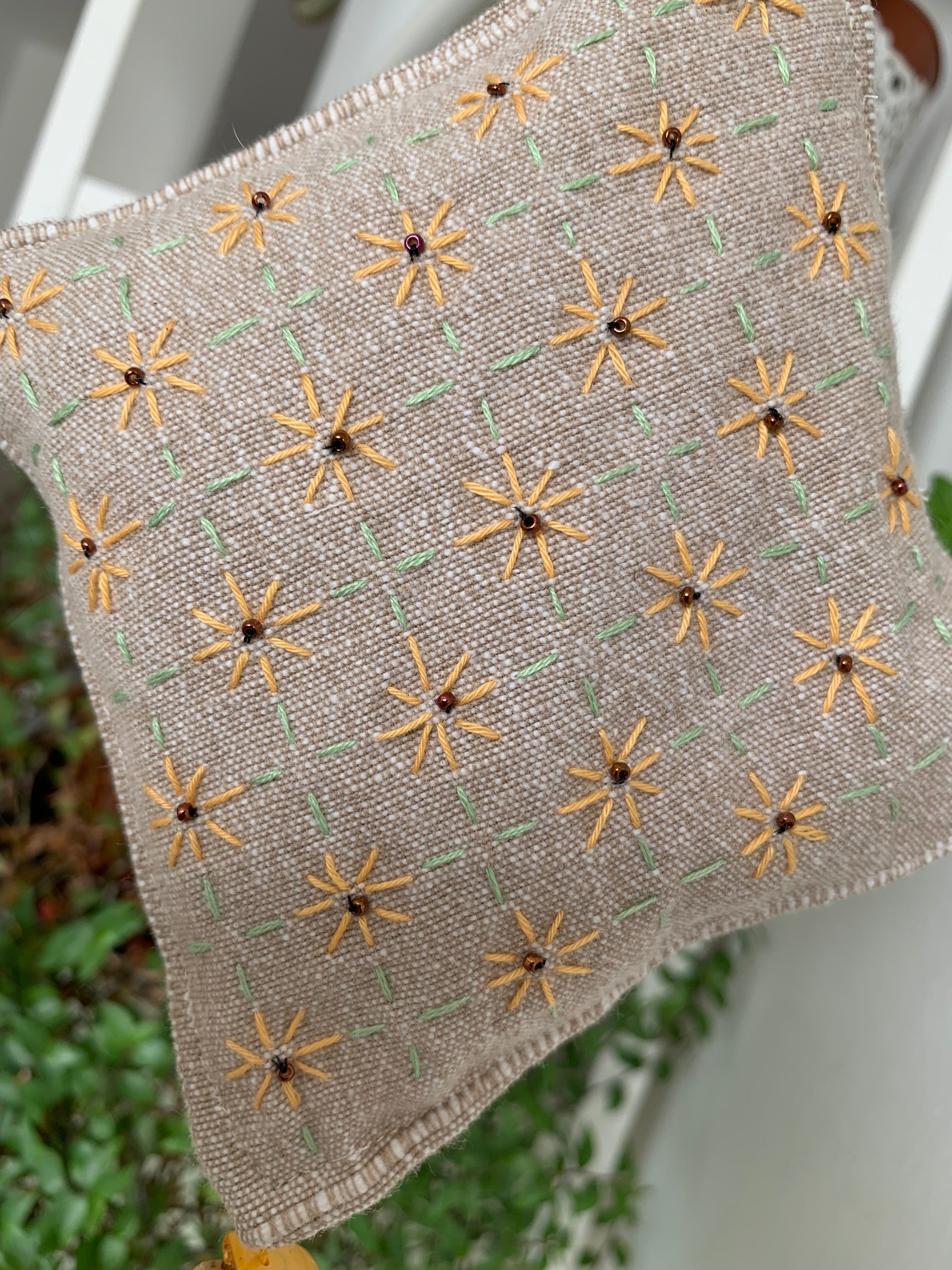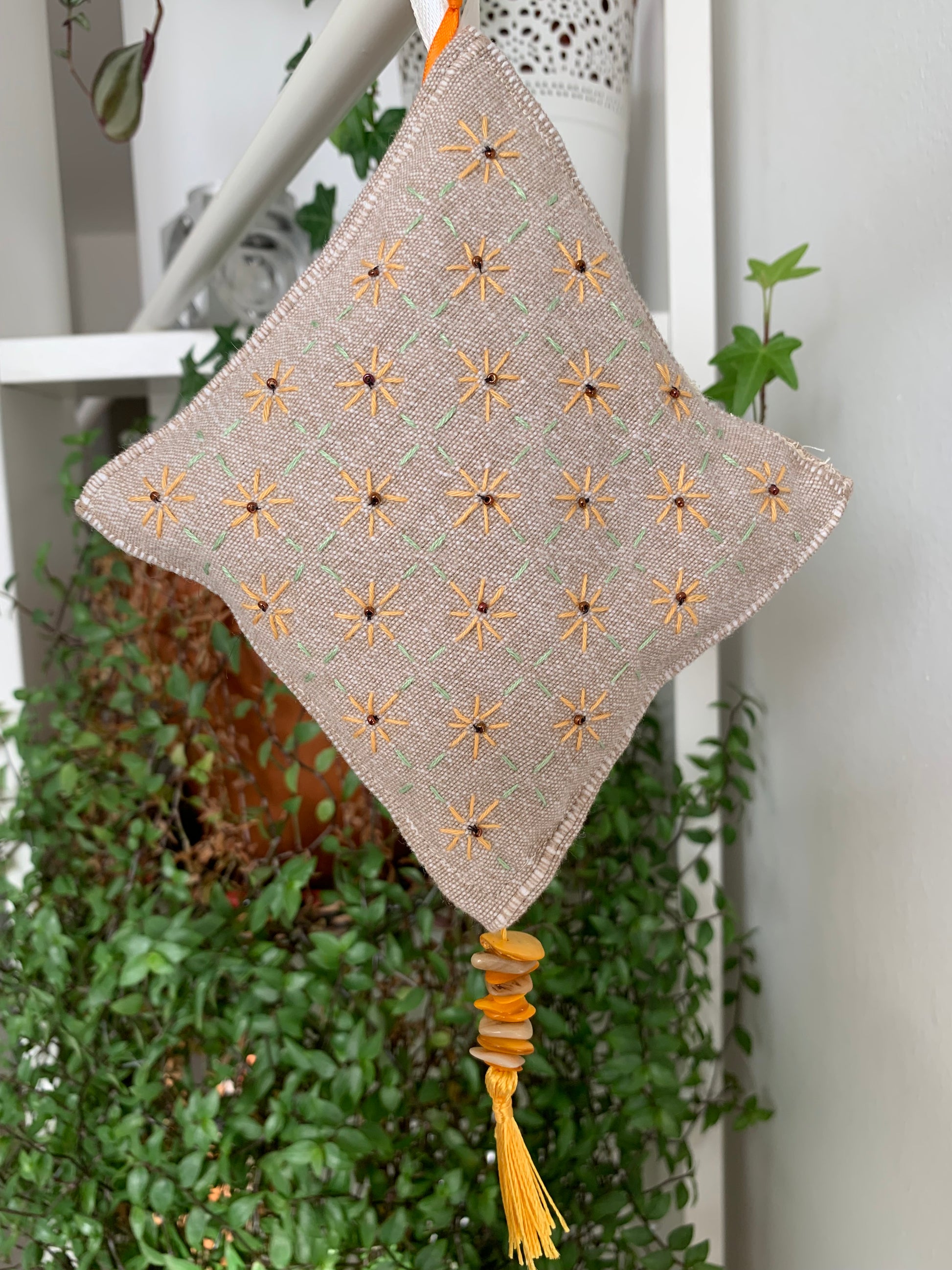 Pochon rempli de lavande séchée bio, une face brodée main et perlée en lin beige, et une face en voile de coton blanc cassé. Taille 12 x 12cm. Ton jaune/marron. Pampille jaune moutarde de 7,5cm dont pétales de verre jaune/orange.
