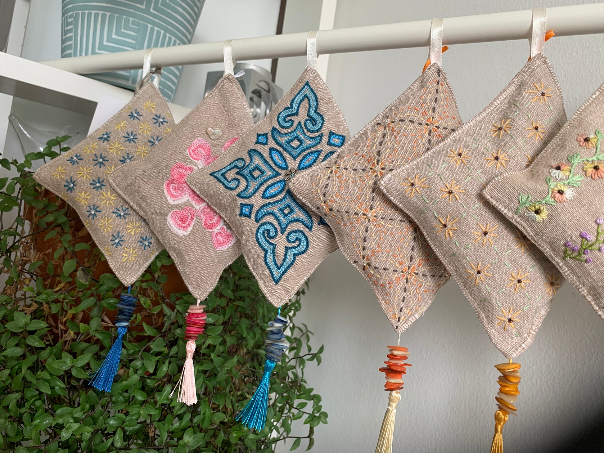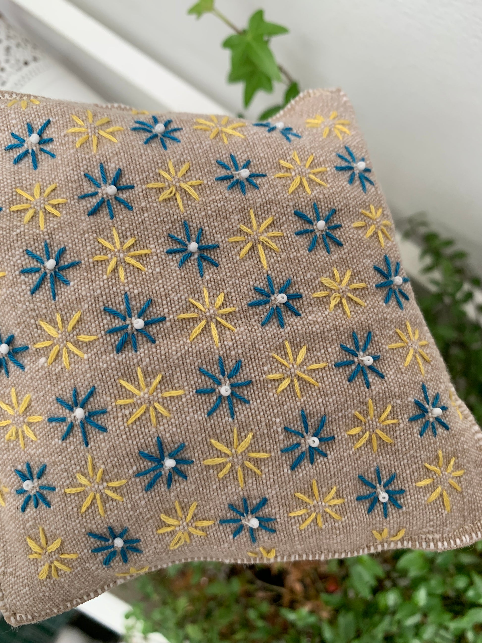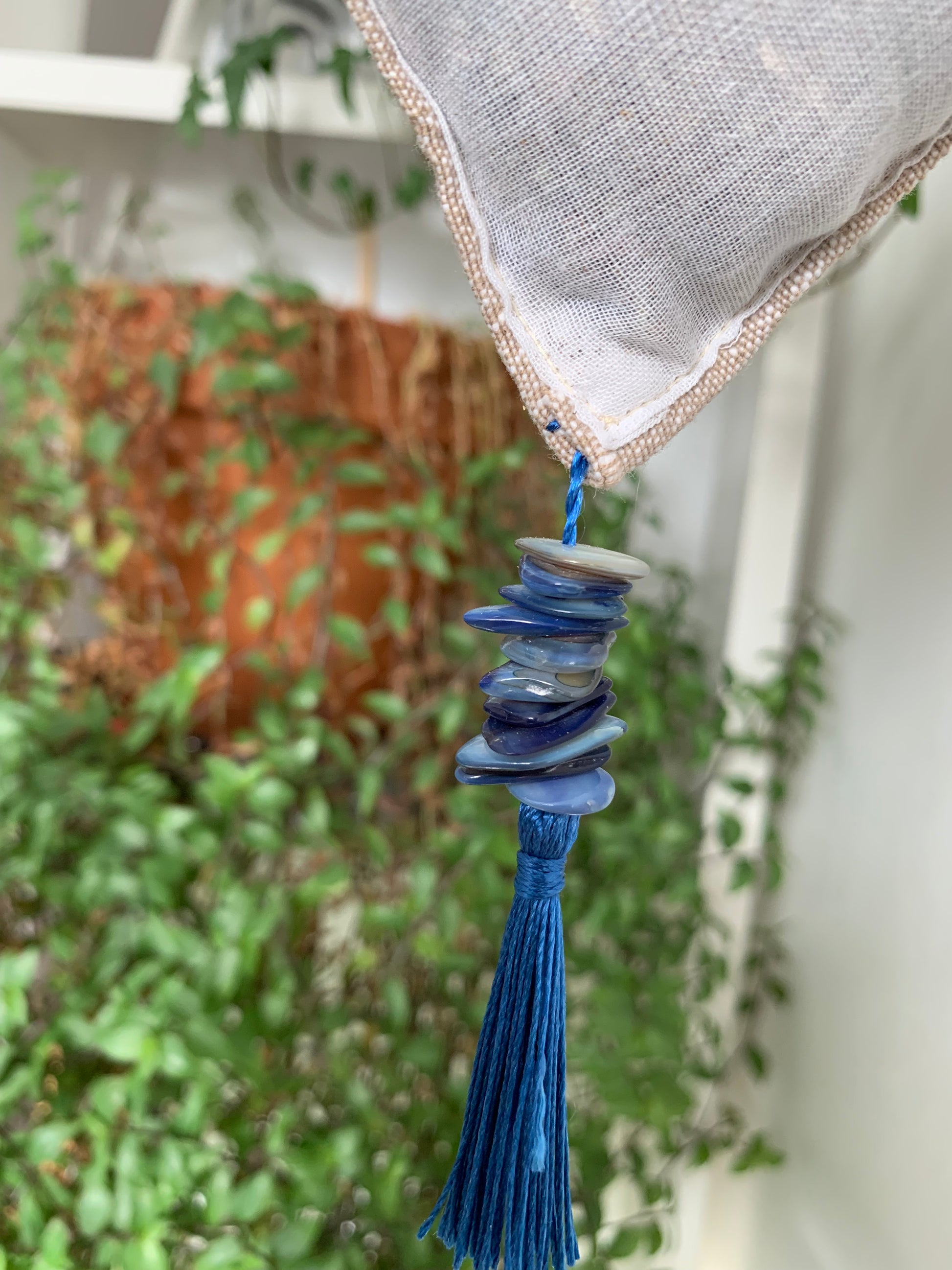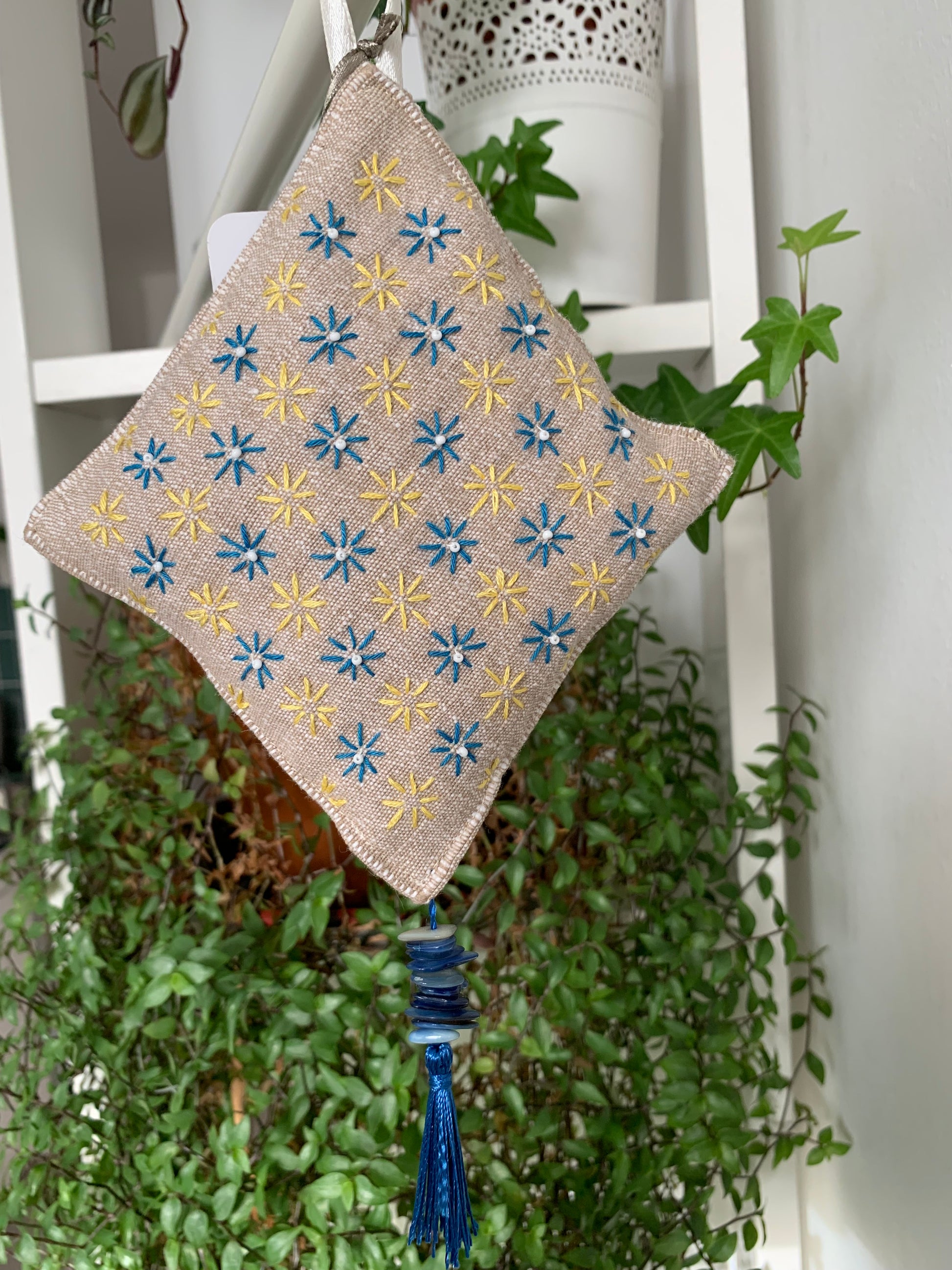 Pochon rempli de lavande séchée bio, une face brodée main et perlée en lin beige et une face en voile de coton blanc cassé. Taille 12 x 12cm. Ton bleu nuit/jaune. Pampille bleu nuit de 7,5cm dont pétales de verre bleu.