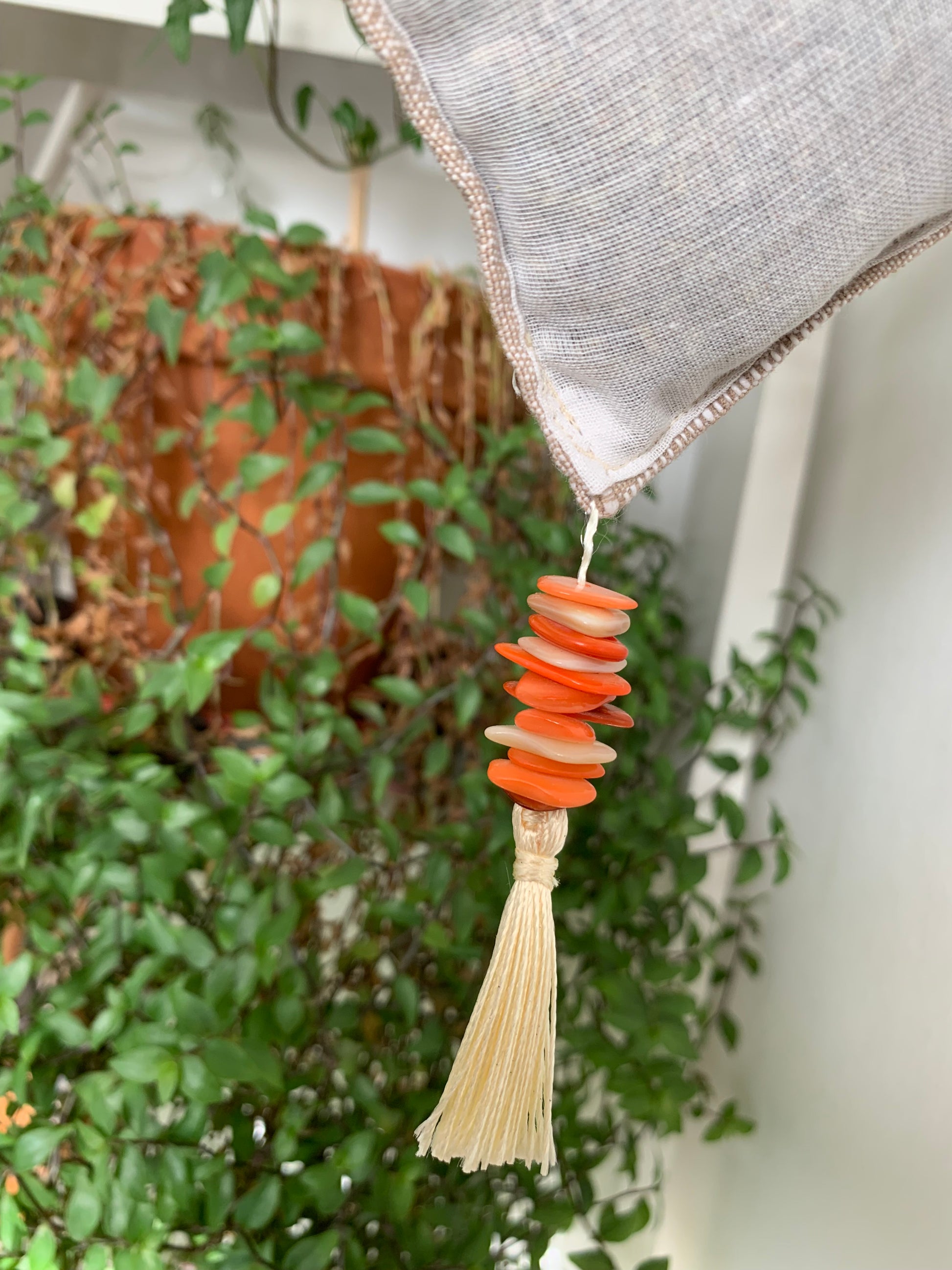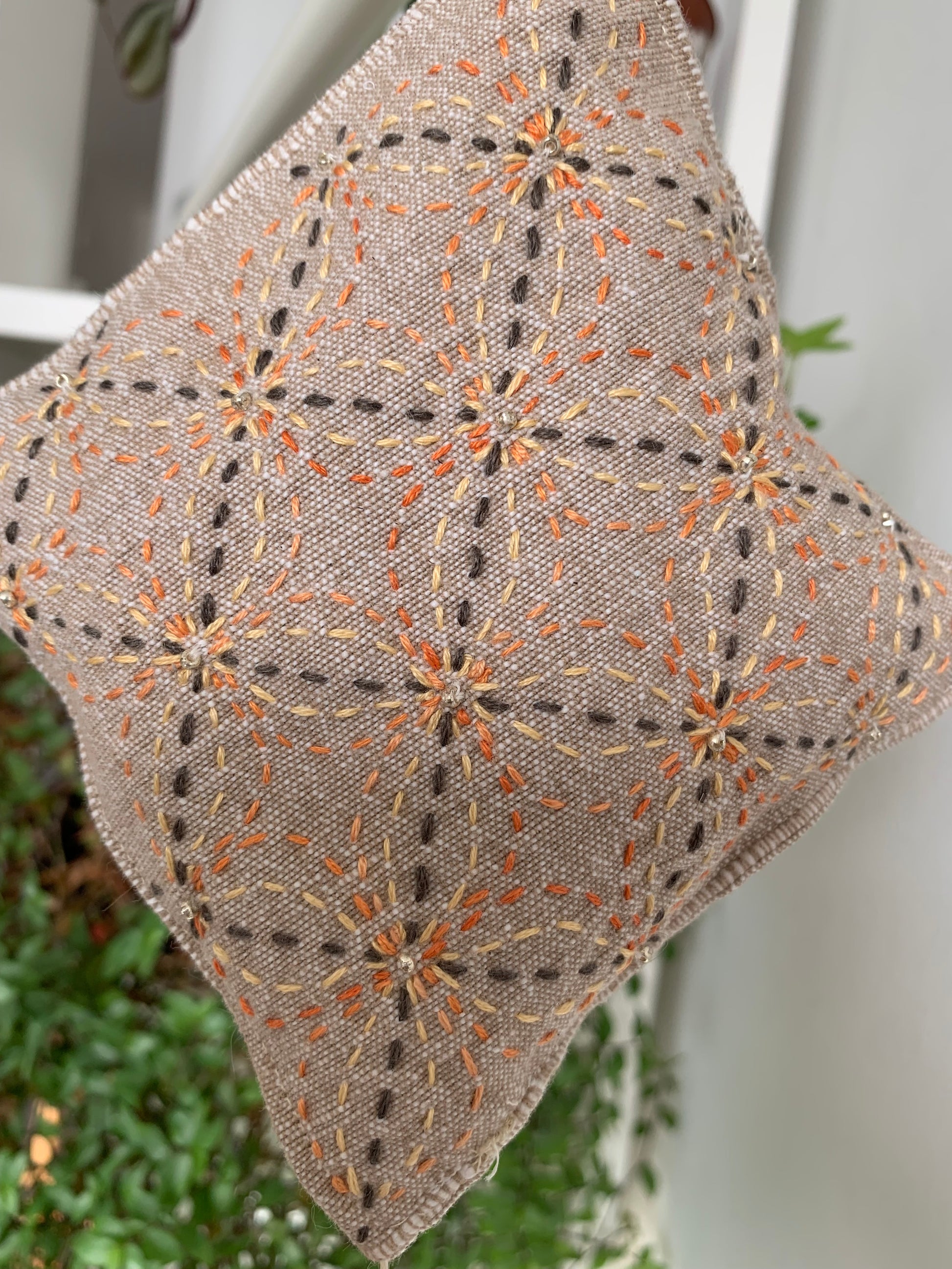 Pochon rempli de lavande séchée bio, une face brodée main et perlée en lin beige et une face en voile de coton blanc cassé. Taille 12 x 12cm. Ton marron/beige/oranger. Pampille beige de 7,5cm dont pétales en verre orange.