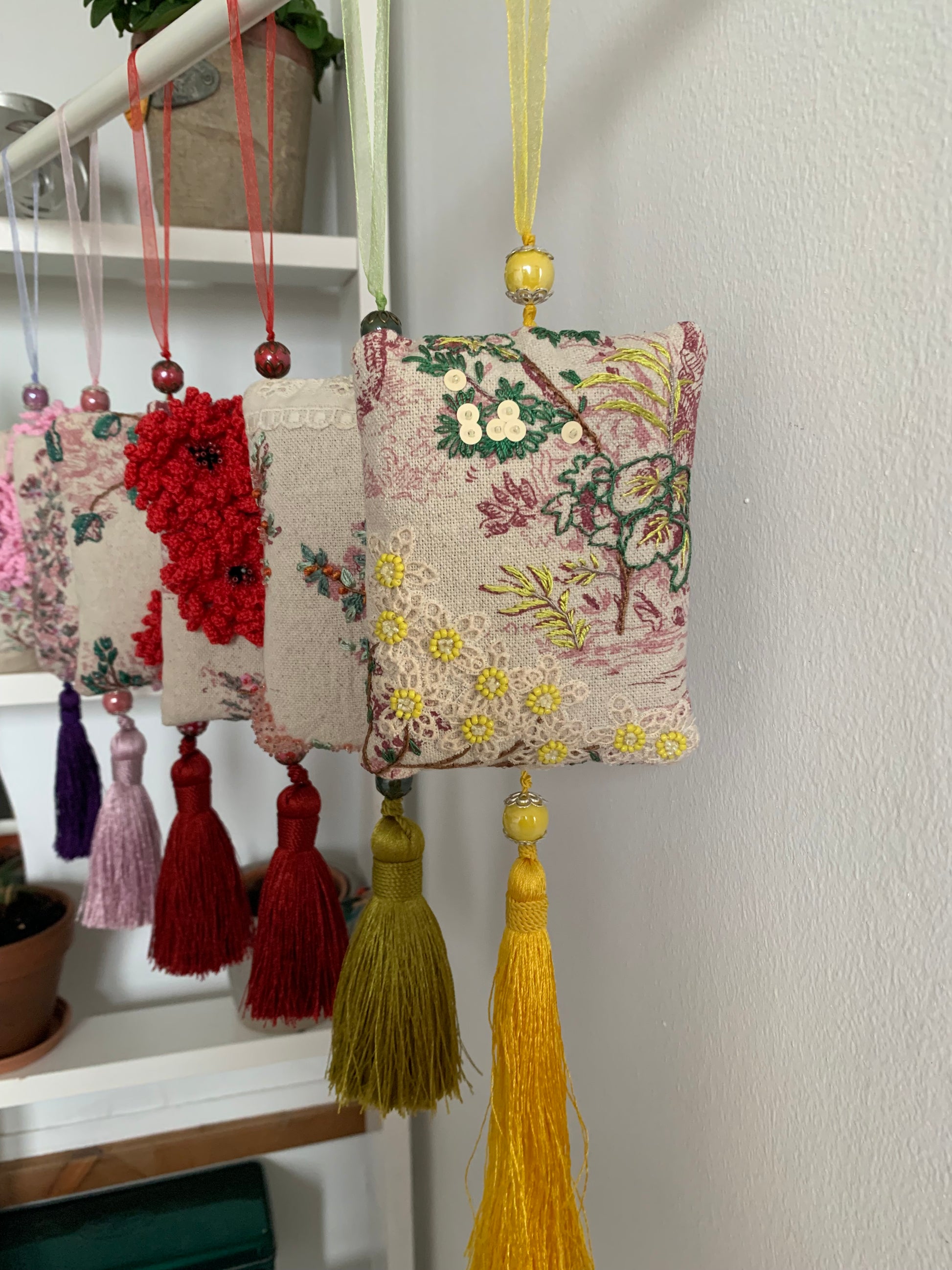 Pochon rempli de lavande bio, brodé sur toile de Jouy rose en coton/lin , dos coton fin beige, 11 x 14cm. Perles, paillettes, fils soie perlée et fleurs en dentelle beige. Pompon satiné jaune et perles en céramique jaune (14mm) avec coupelles métal argent 18cm. Attache en organza jaune.