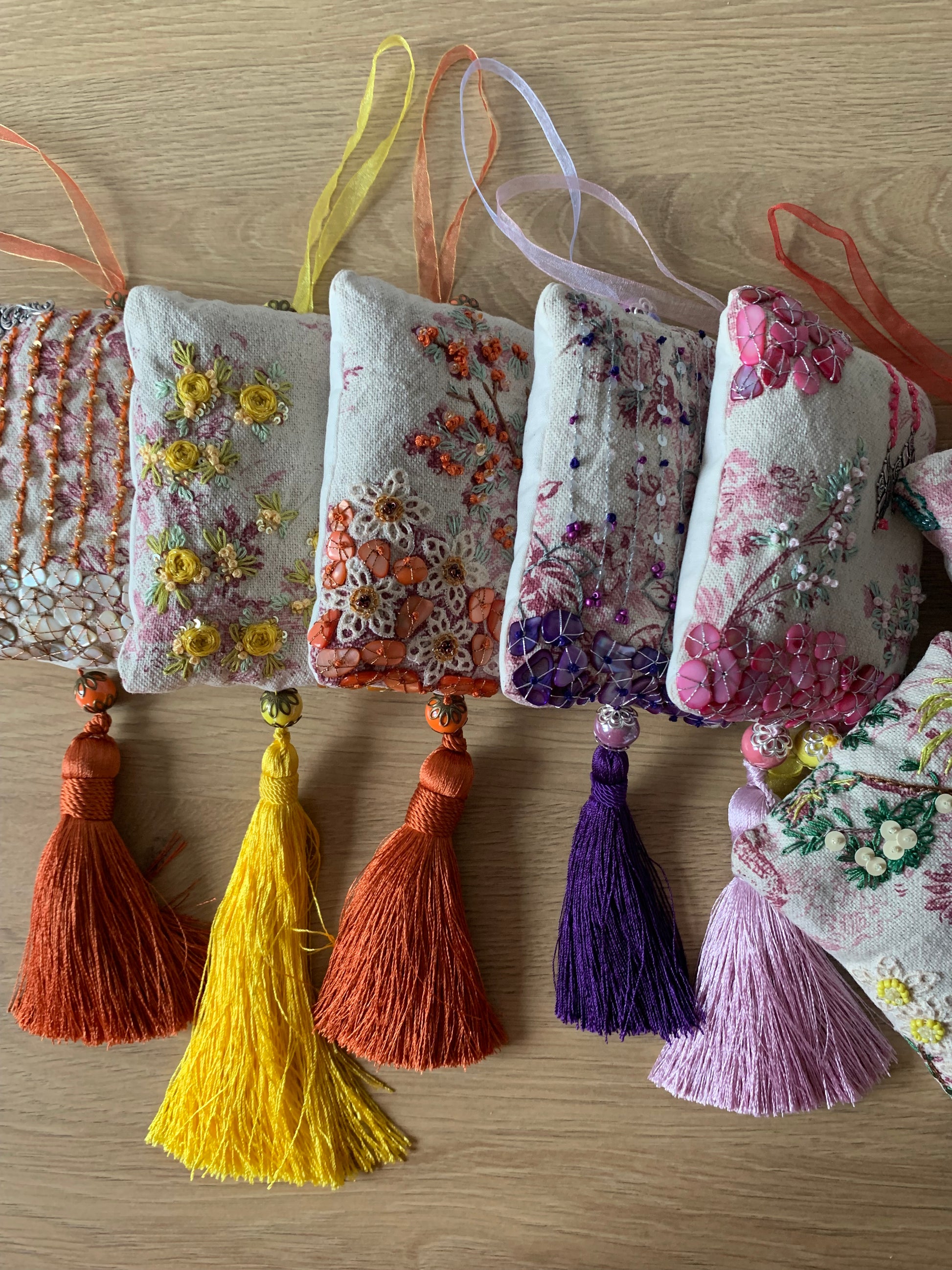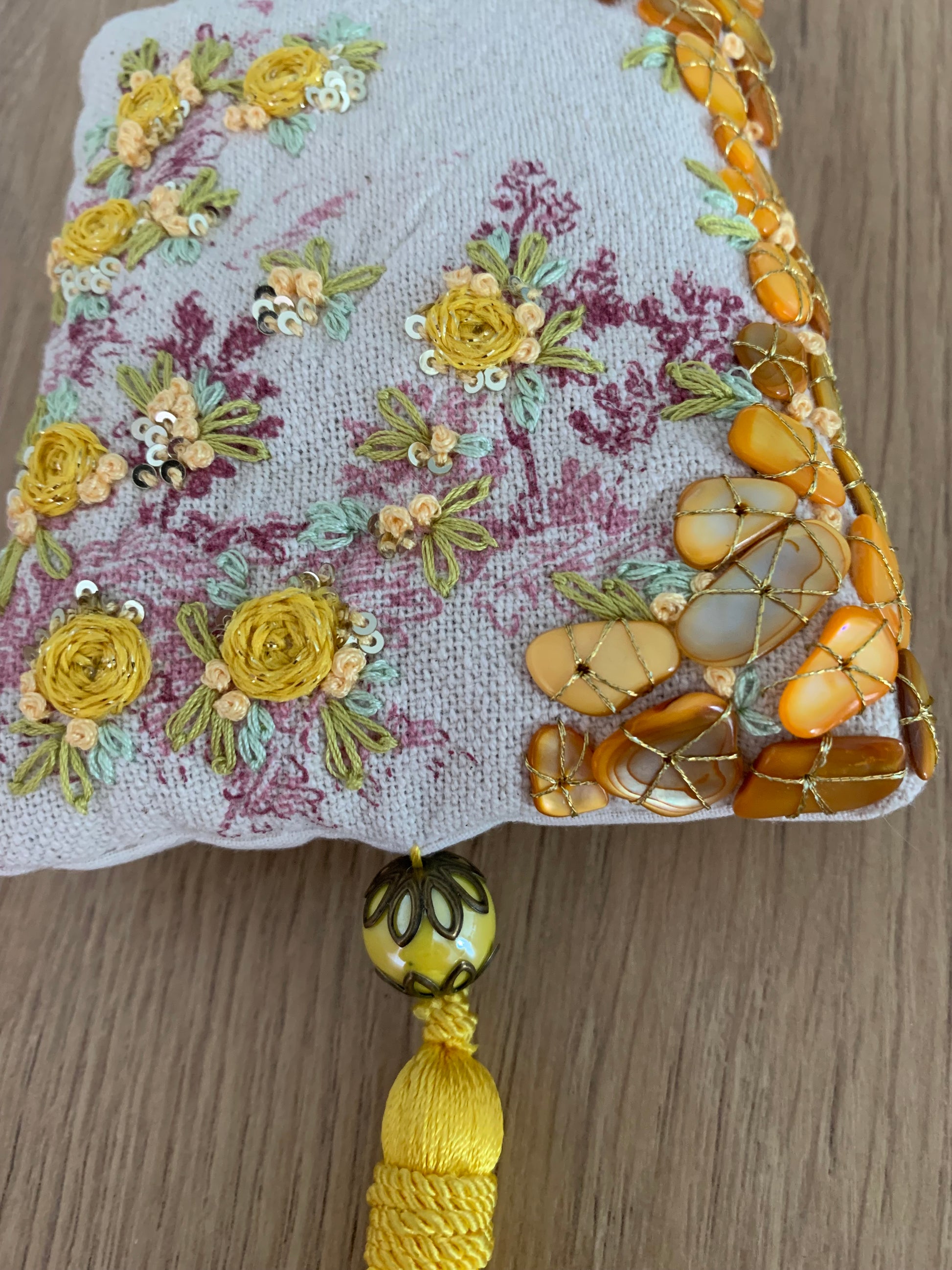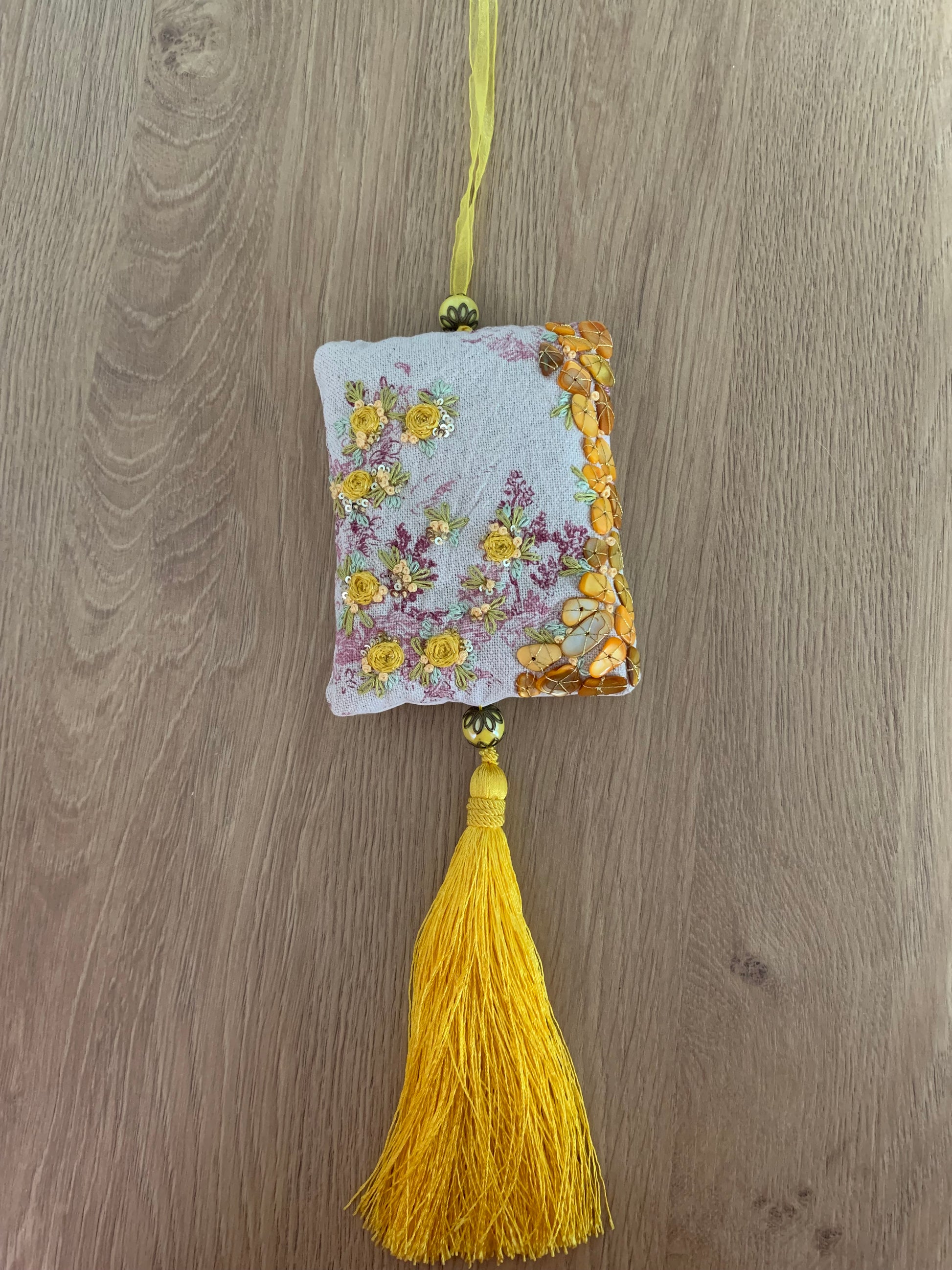 Pochon rempli de lavande bio, brodé sur toile de Jouy rose en coton/lin , dos coton fin beige, 11 x 14cm. Fils retors du nord et fil Tonkin, fil métallisé or. Paillettes et pétales de verre jaune. Pompon satiné jaune et perles en céramique jaune (14mm) avec coupelles métal bronze, 18cm. Attache en organza jaune.