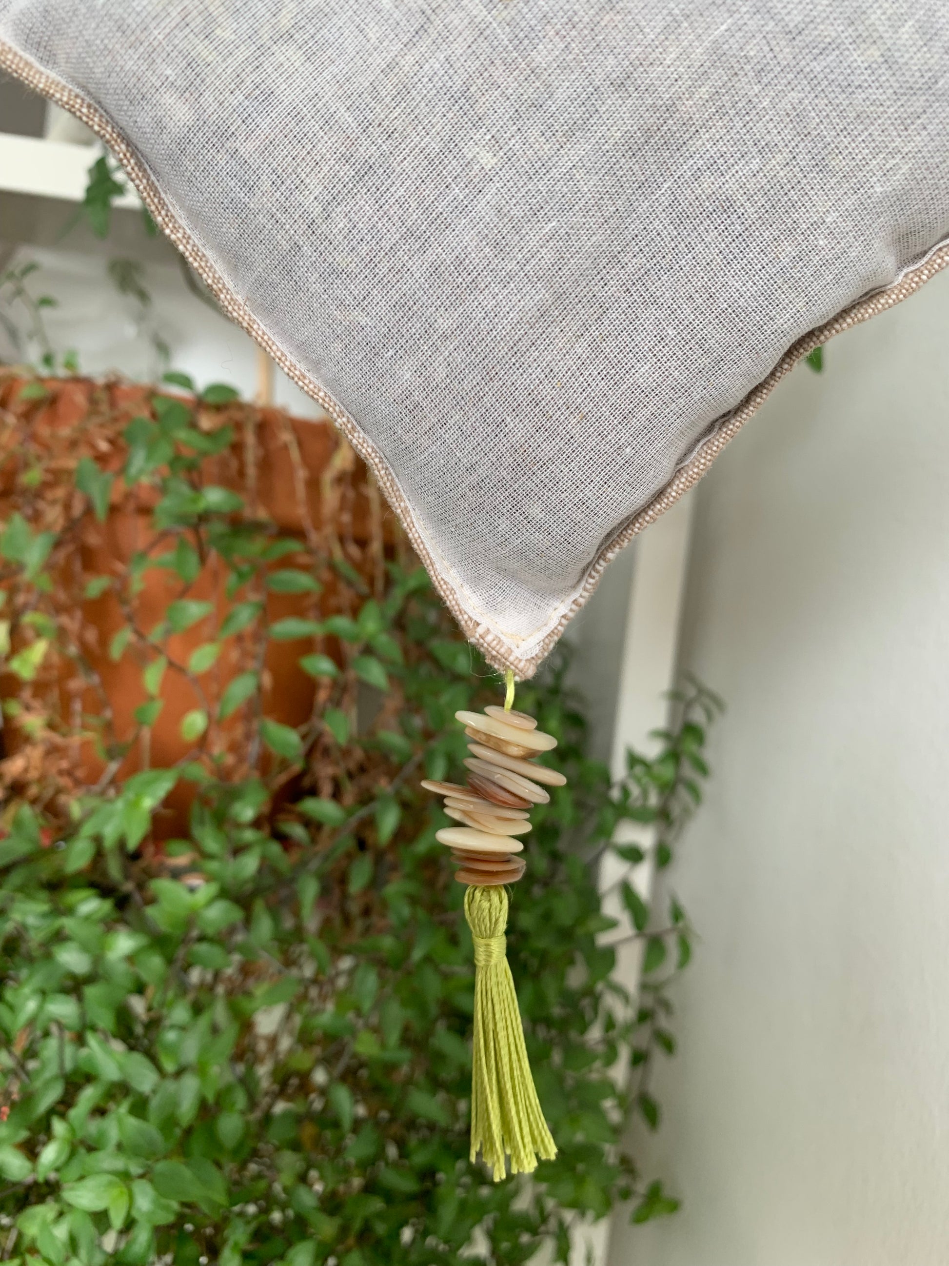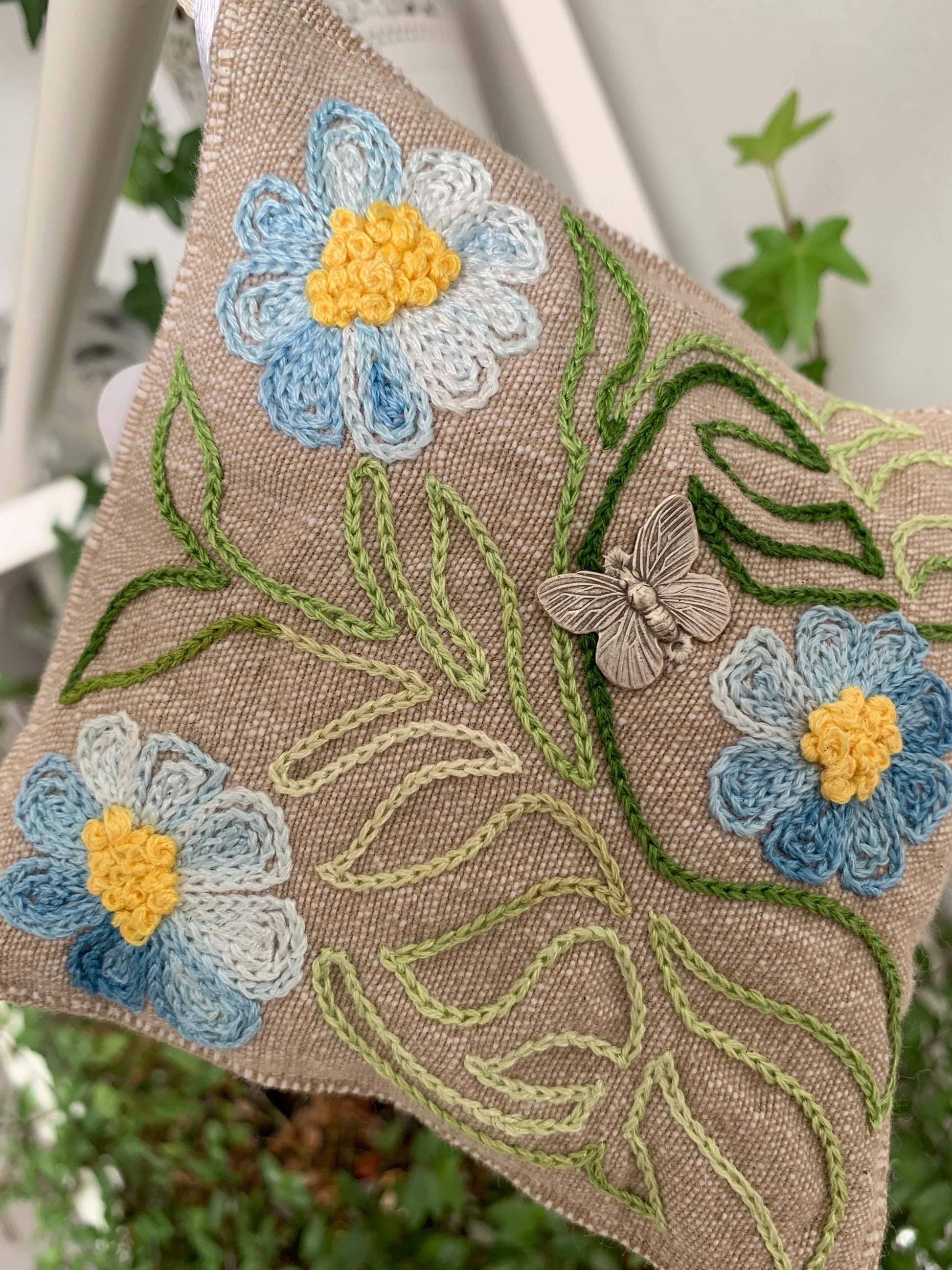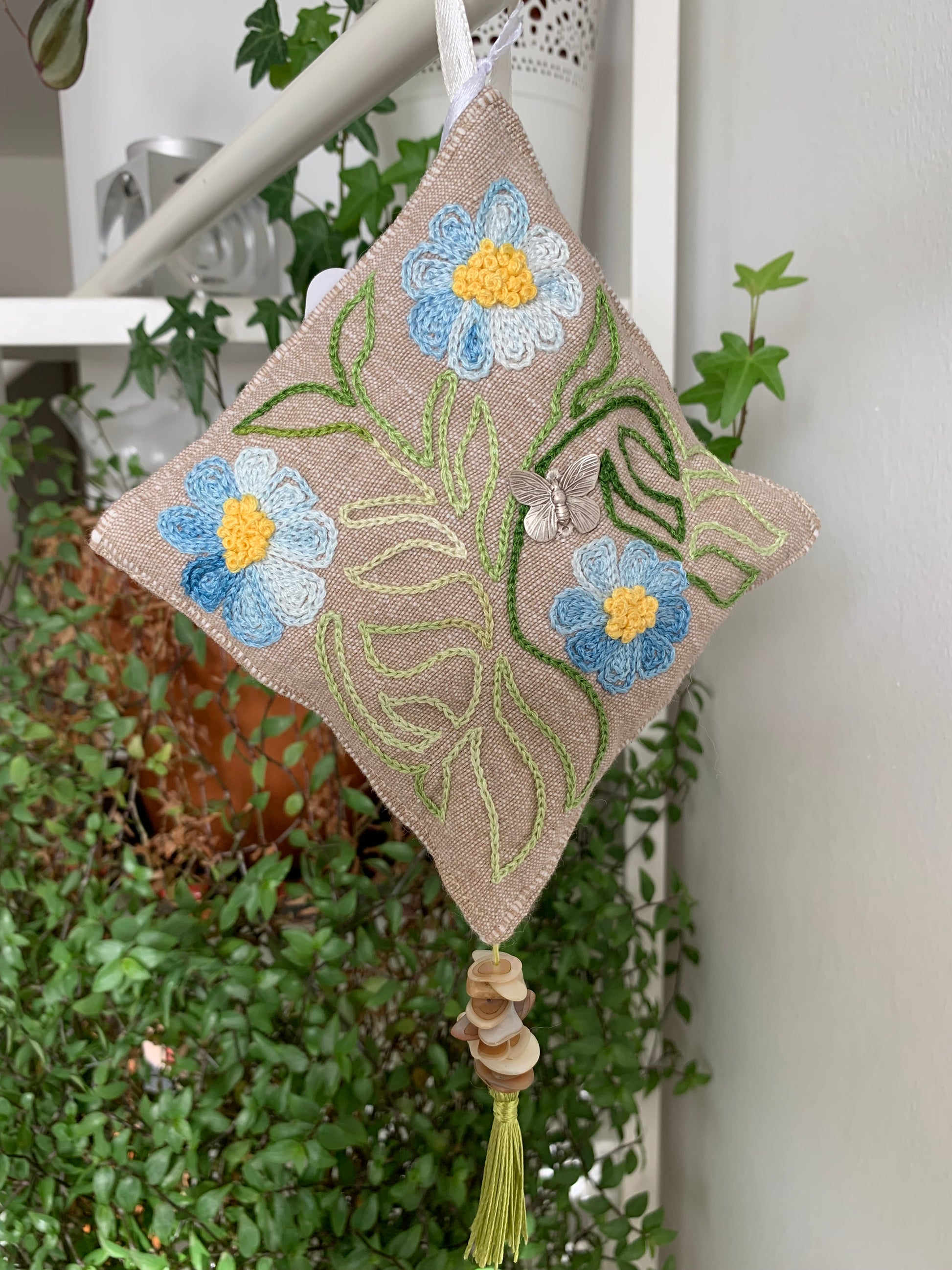 Pochon rempli de lavande séchée bio, une face brodée main en lin beige et applique papillon en métal et une face en voile de coton blanc cassé. Taille: 12 x 12cm. Ton vert/bleu. Pampille vert clair de 7,5cm dont pétales de verre beige.