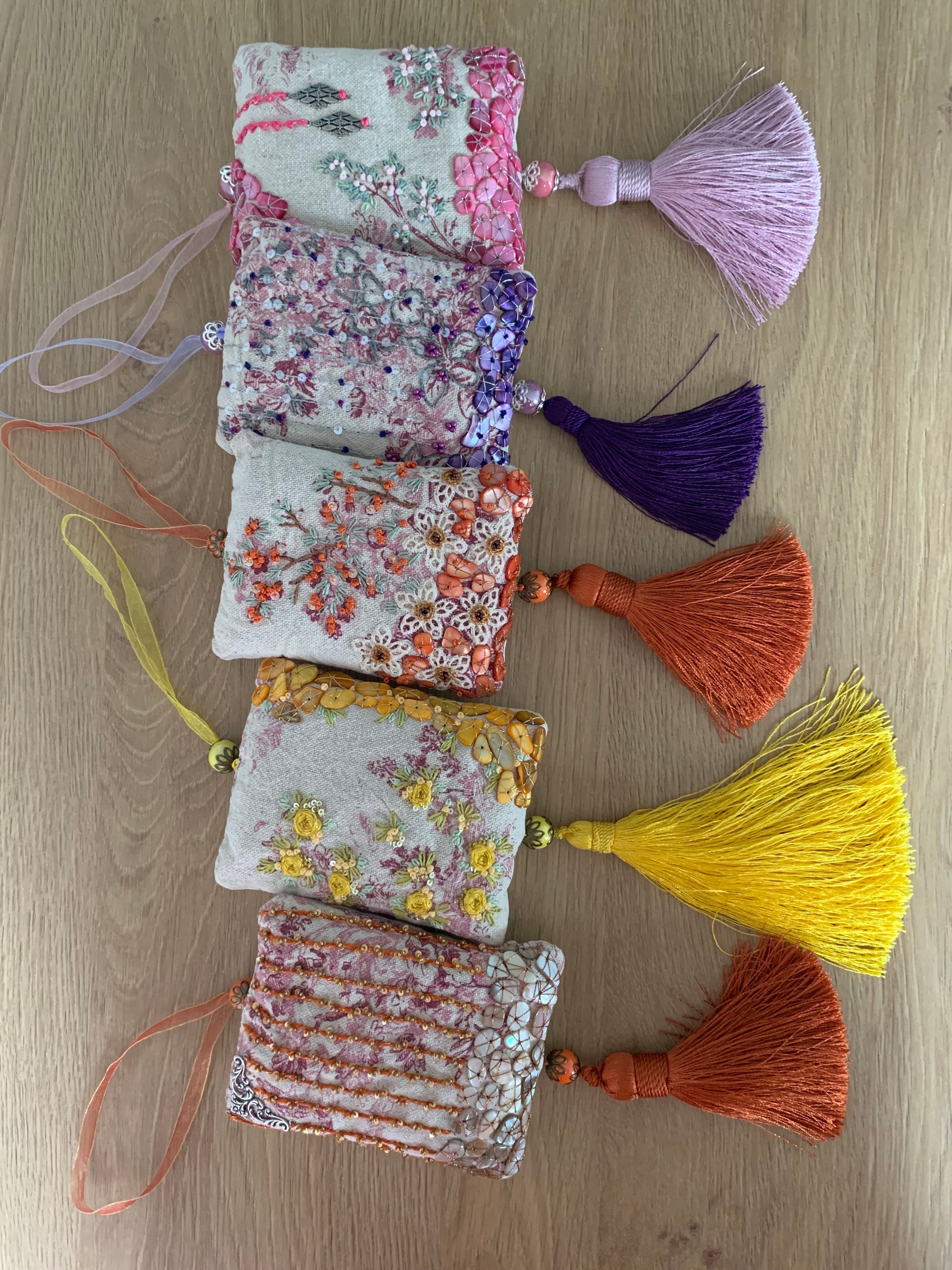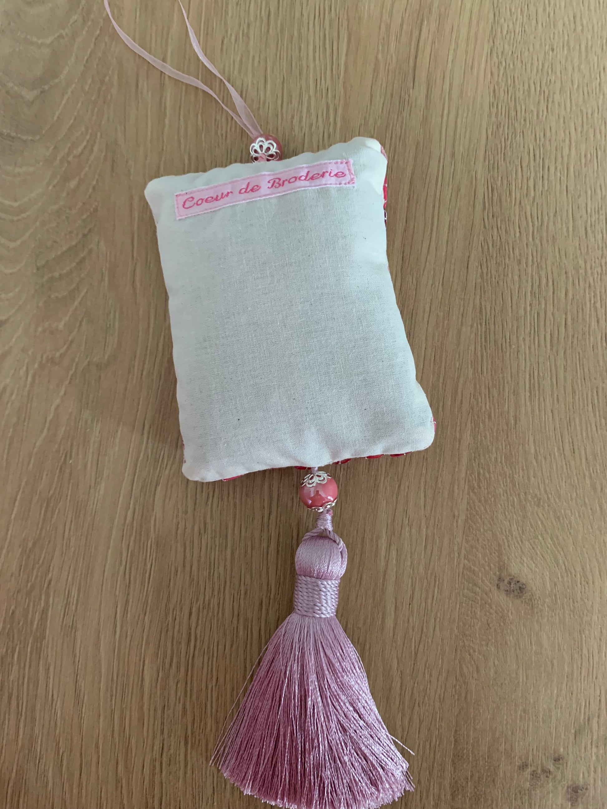 Pochon rempli de lavande bio, brodé sur toile de Jouy rose en coton/lin , dos coton fin beige, 11 x 14cm. Fils soie perlée, fils métallique argent, deux appliques métal argent et pétales de verre coloré rose. Pompon satiné rose et perles en céramique rose (14mm) avec coupelles métal argent, 12cm. Attache en organza rose.