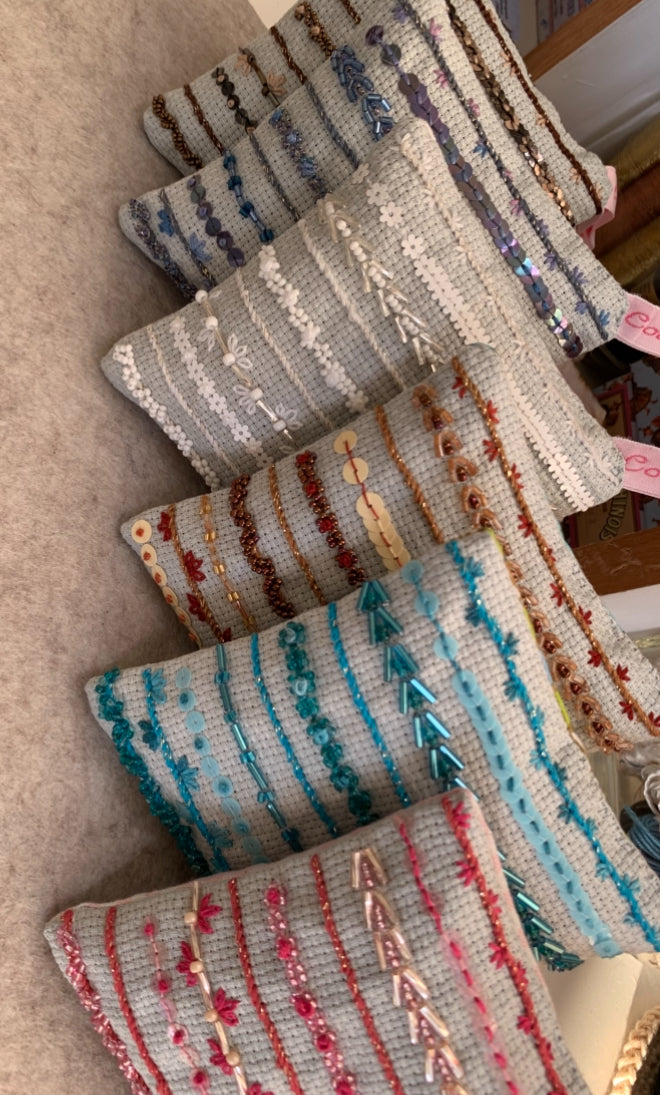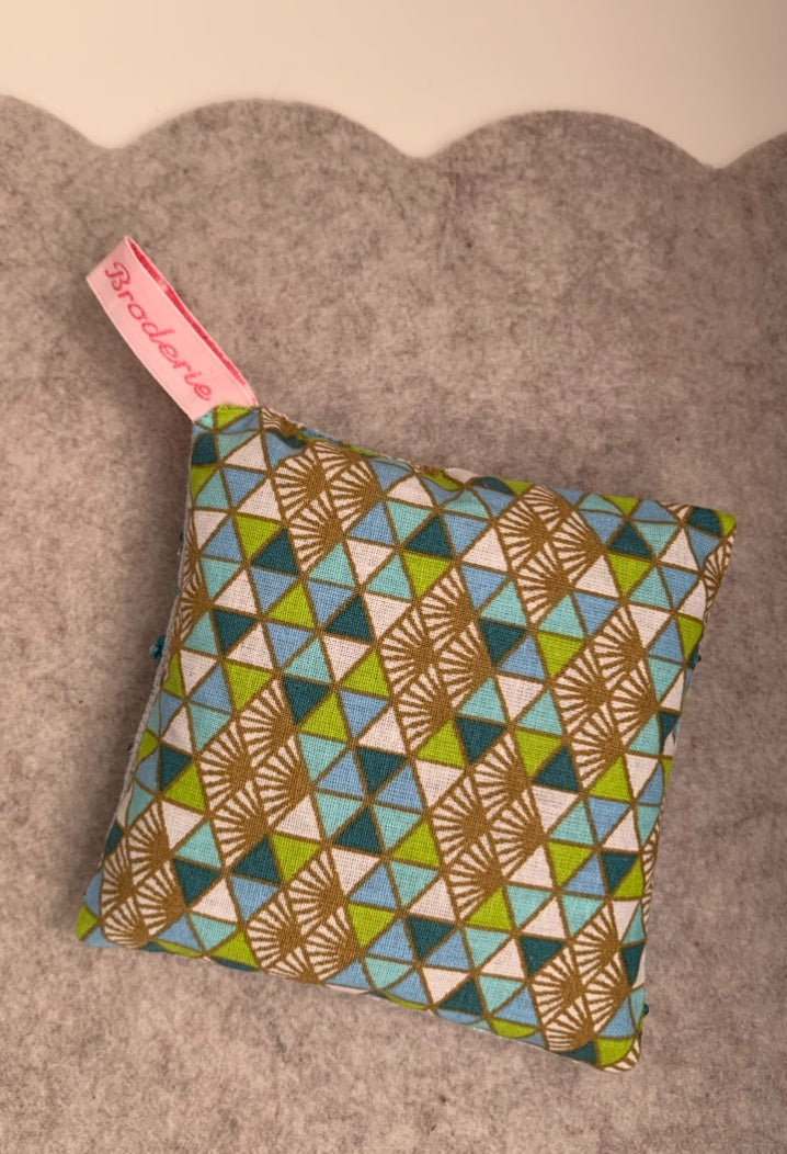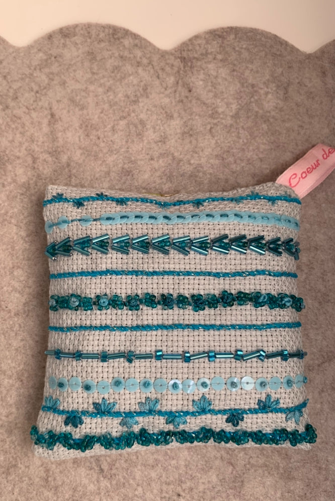 Pochon rempli de lavande bio, brodé au fil Tonkin et coton DMC, perlé rocaille ancienne bleue, paillettes bleu ciel brillant et tubes et demi-tubes turquoise brillant, sur toile Aïda vert-de-gris pâle. Dos coton imprimé japonais.