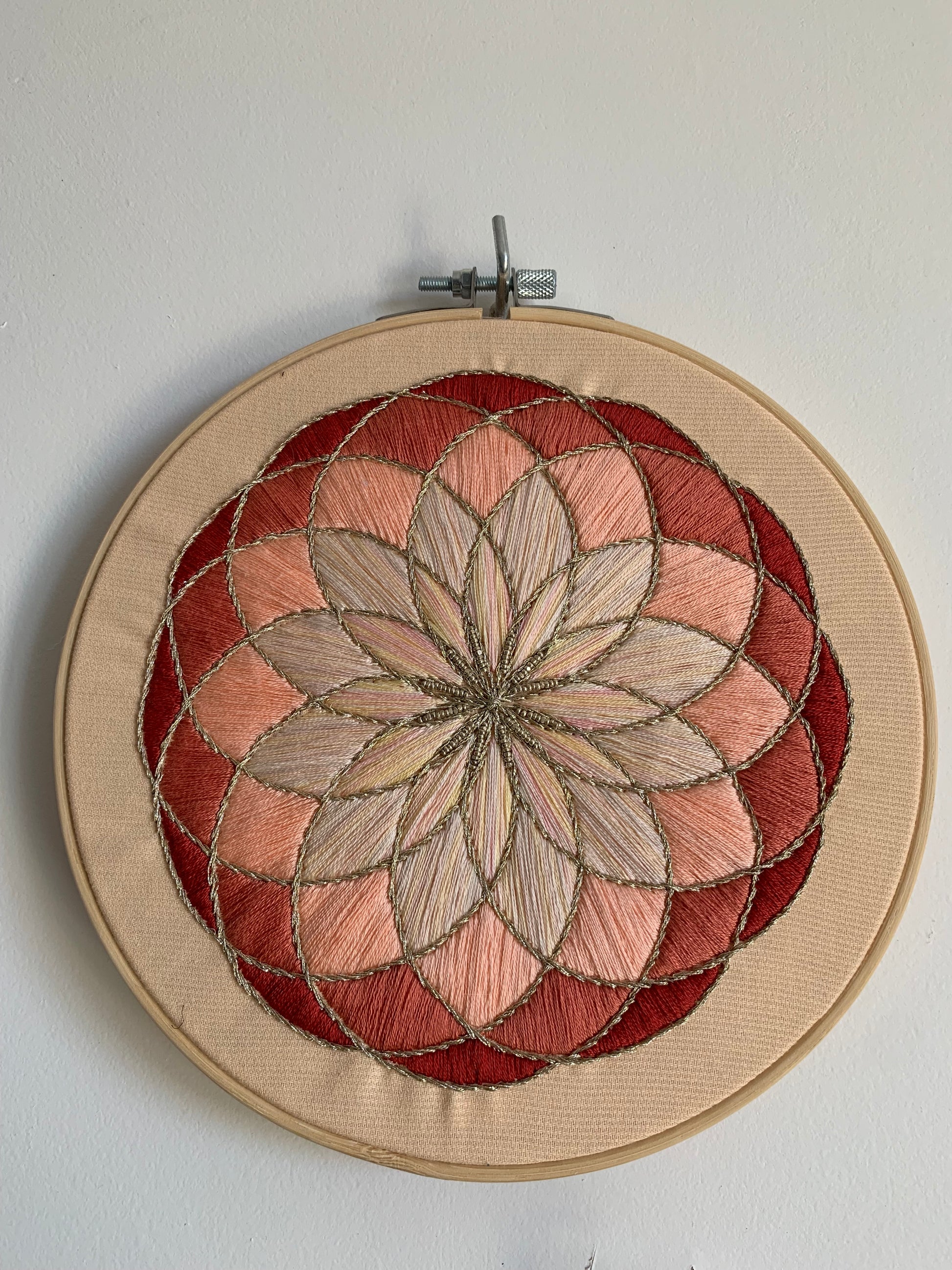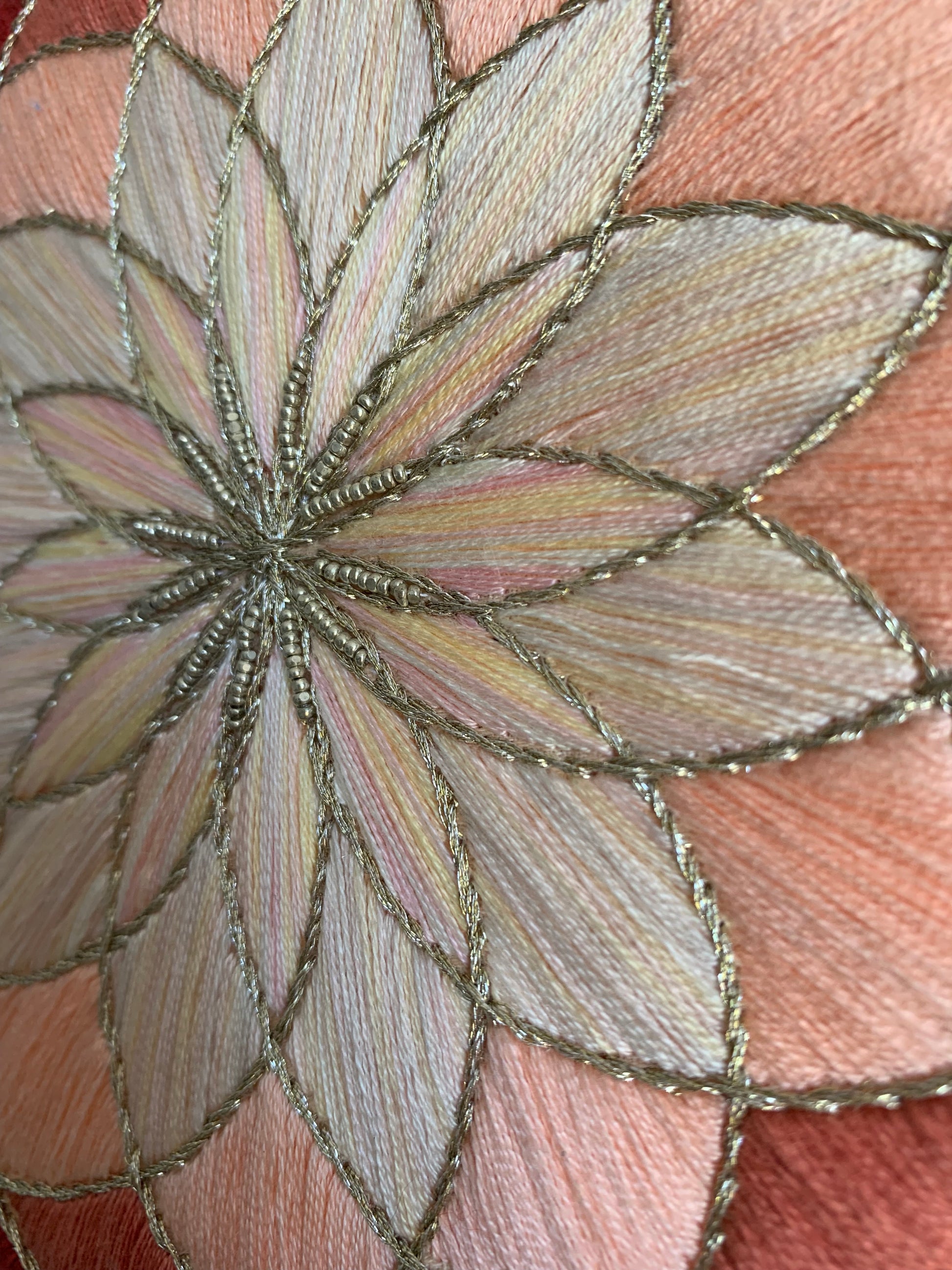 Tambour en bambou de 20cm de diam., broderie traditionnelle en coton DMC et fil métallisé, perles, sur toile de coton couleur pêche. Toile de coton au dos.